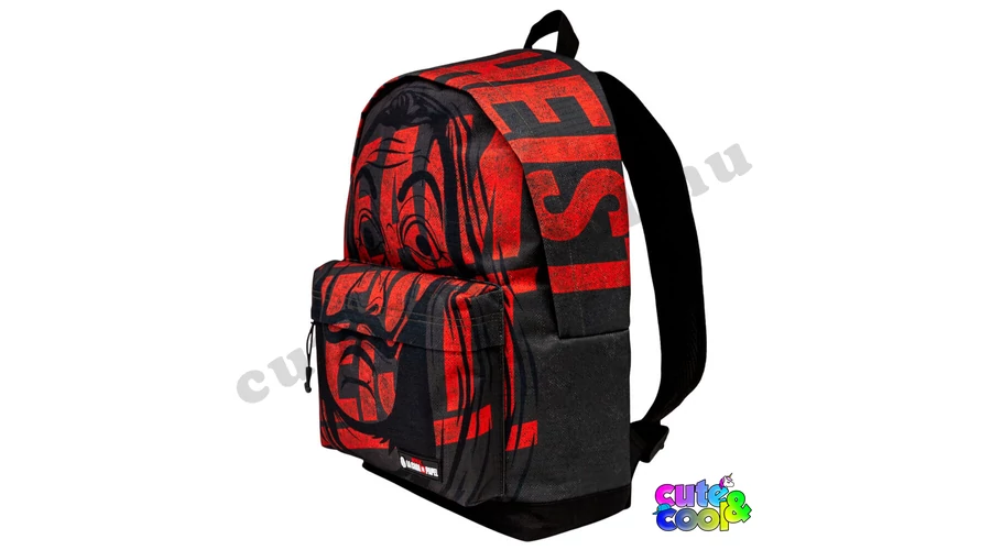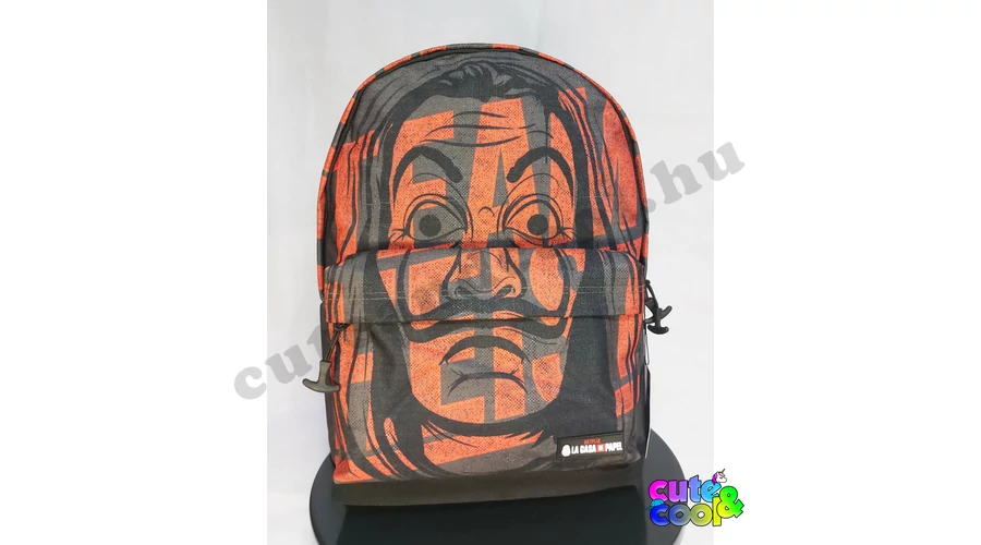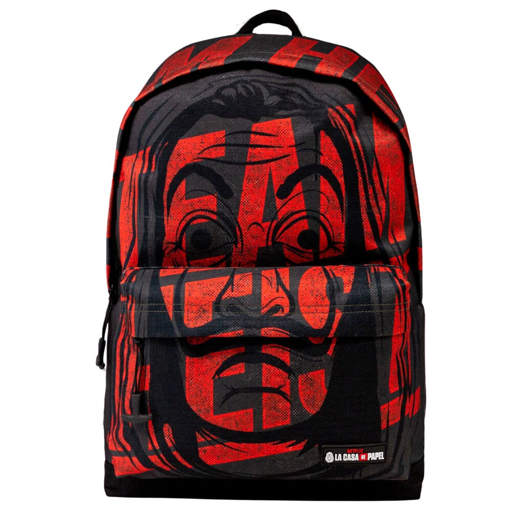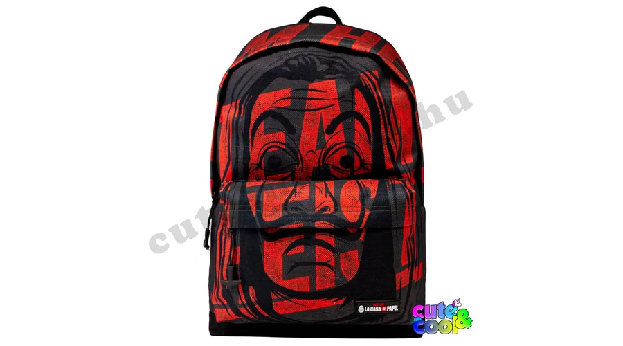 - big-sized Money Heist school bag - premium quality - massive, durable, reliable - 2 compartments with zip closure - padded back - adjustable padded shoulder straps - strong handle - featuring mask of Dalí along with the La Casa de Papel logo - color: red, black Excellent choice for school!