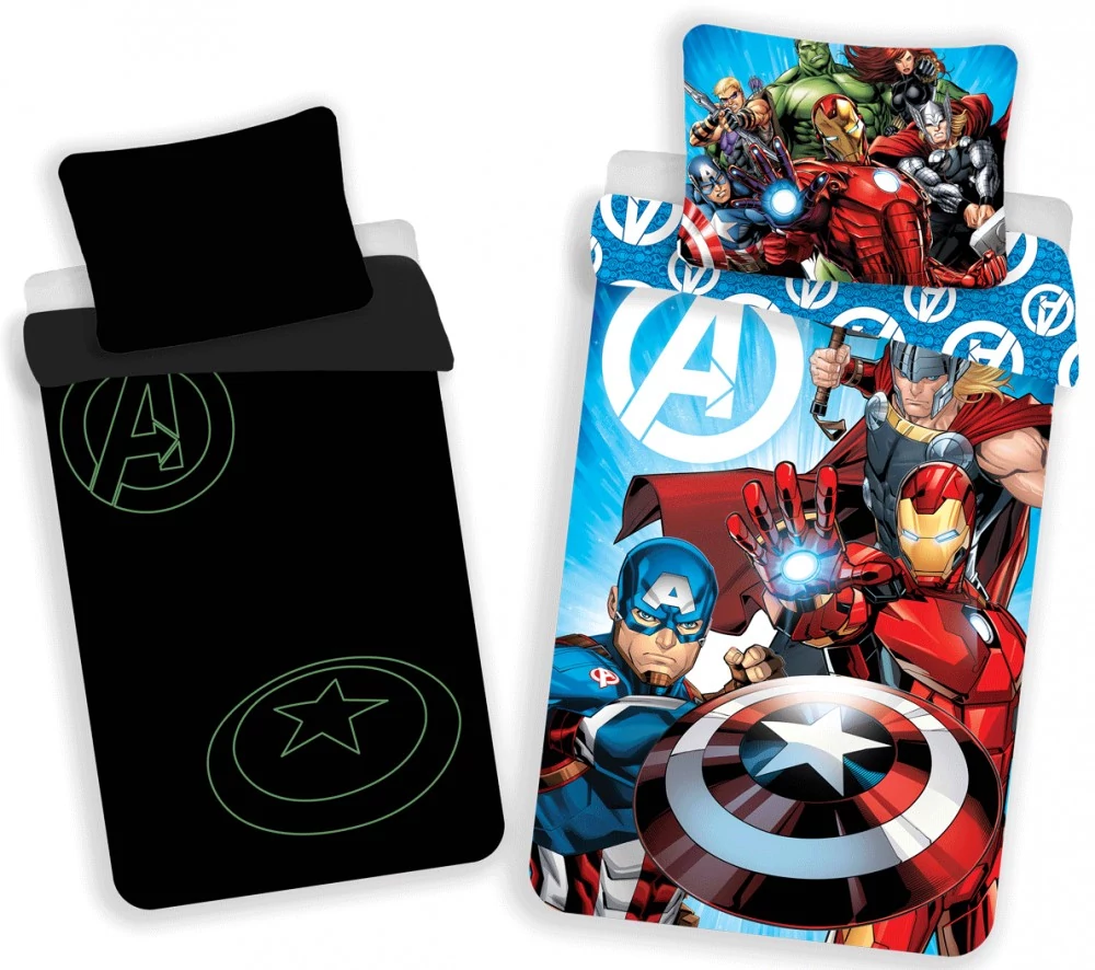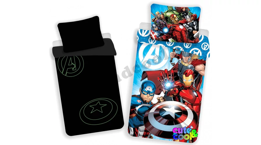 - official Marvel bed linen set (two pieces) - premium cotton quality - glowing in the dark (logo and the shield) - two-sided - durable color - featuring characters from the Marvel universe: Iron Man, Captain America, Thor, Hulk and etc.