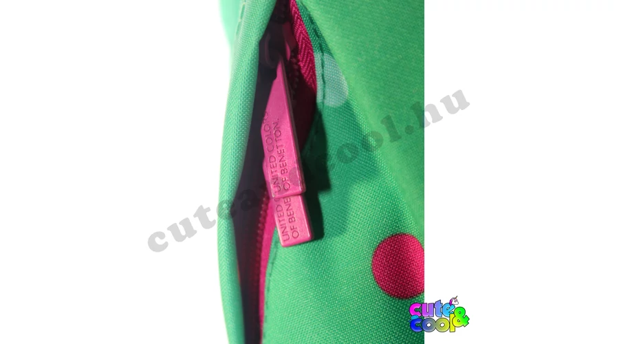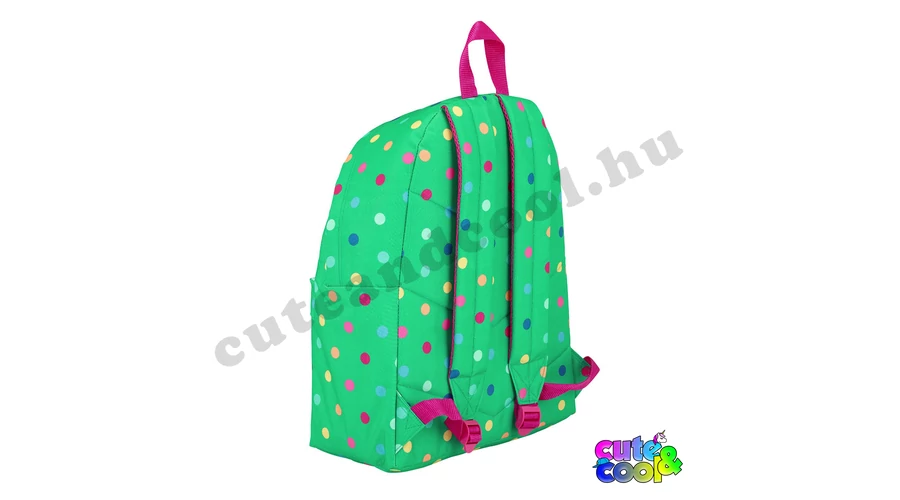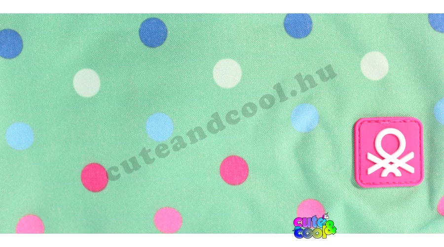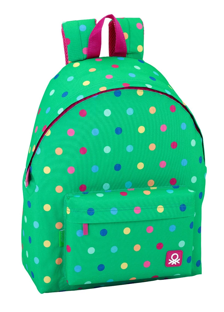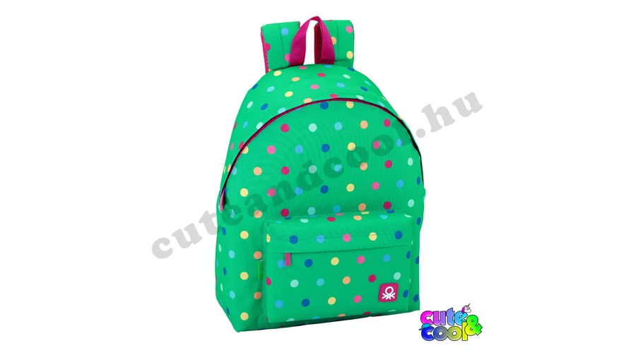 Kiváló minőségű Benetton, zöld alapon színes pöttyös hátizsák. Egyterű, elején nagyméretű zsebbel. Párnázott hátsó rész, párnázott és állítható vállpántok a kényelmes viselet érdekében.