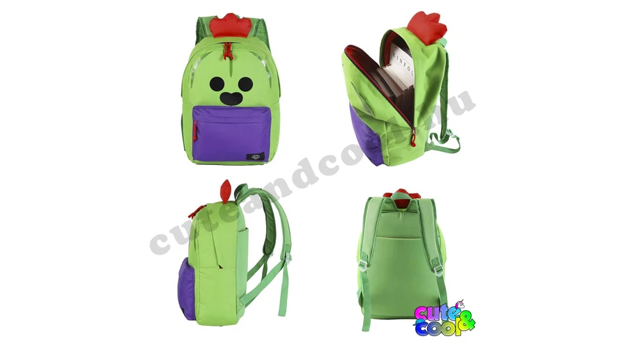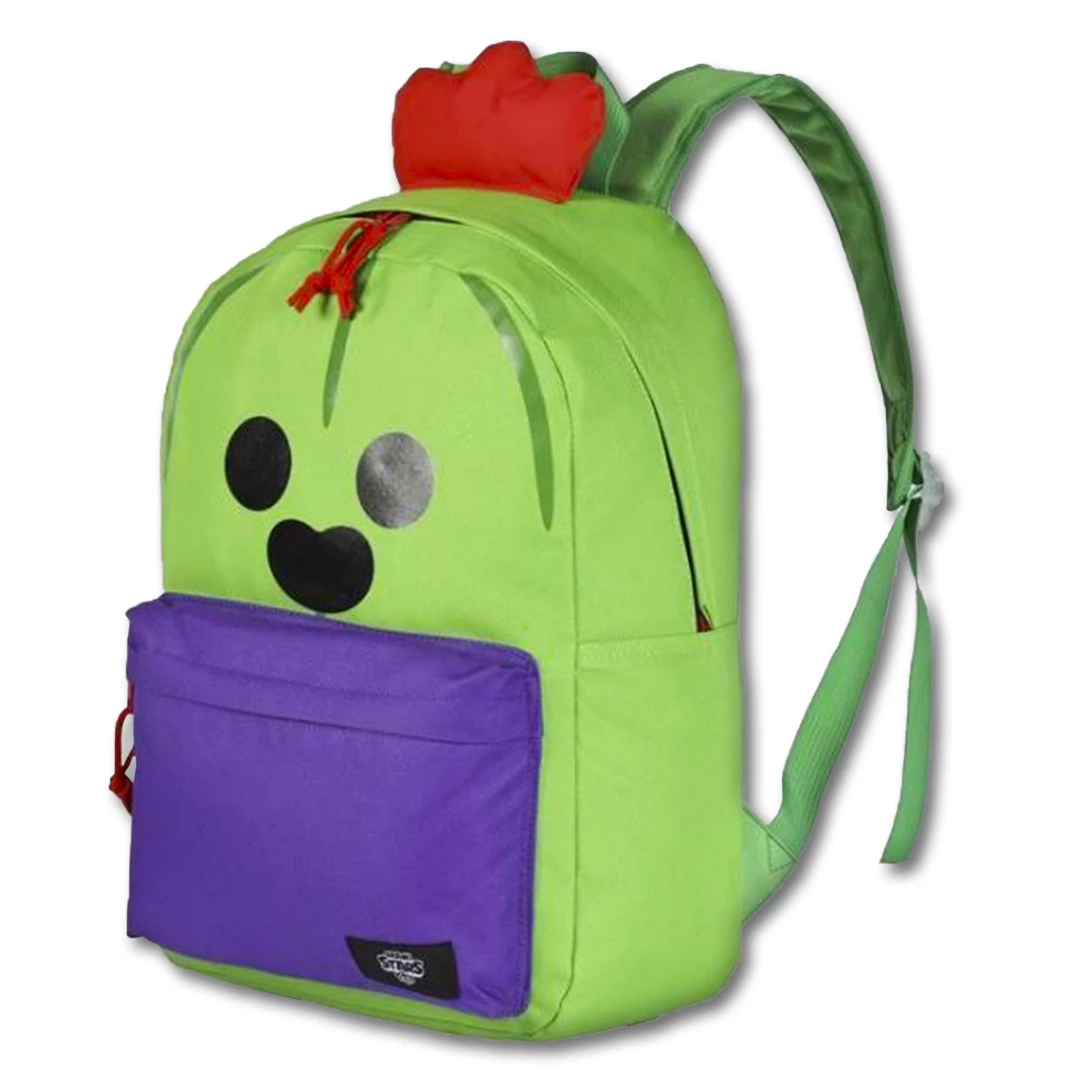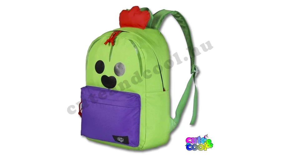 A Brawl Stars zöld karaktere, Spike elevenedik meg ezzel az iskolatáskával. A táskának egy cipzáros főrekesze és egy cipzáros elülső zsebe van. A belsejében egy gumis elválasztót találsz, hogy a könyvek ne csúszkáljanak. Az erős anyagú, redeti Brawl Stars táska 40 x 29 x 12 cm ami egy tökéletes méretű iskolatáska. A hát része vastagon párnázott, vállpántjai vékonyan szivacsozottak és állíthatóak a tökéletes kényelemért. A táska külseje egy az egyben a Brawl Stars, Spike karaktere a lila nadrágban lévő zöld kaktuszfigura a piros hajával.