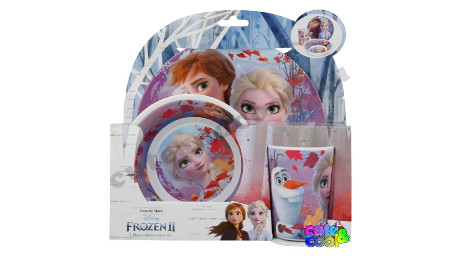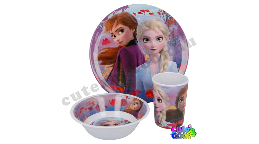 - 3 pieces lunch bag set - Frozen tale design - premium quality - featuring Elsa and Anna Material: 100% BPA free plastic 1 deep plate 1 flat plate 1 glass Officially licensed product