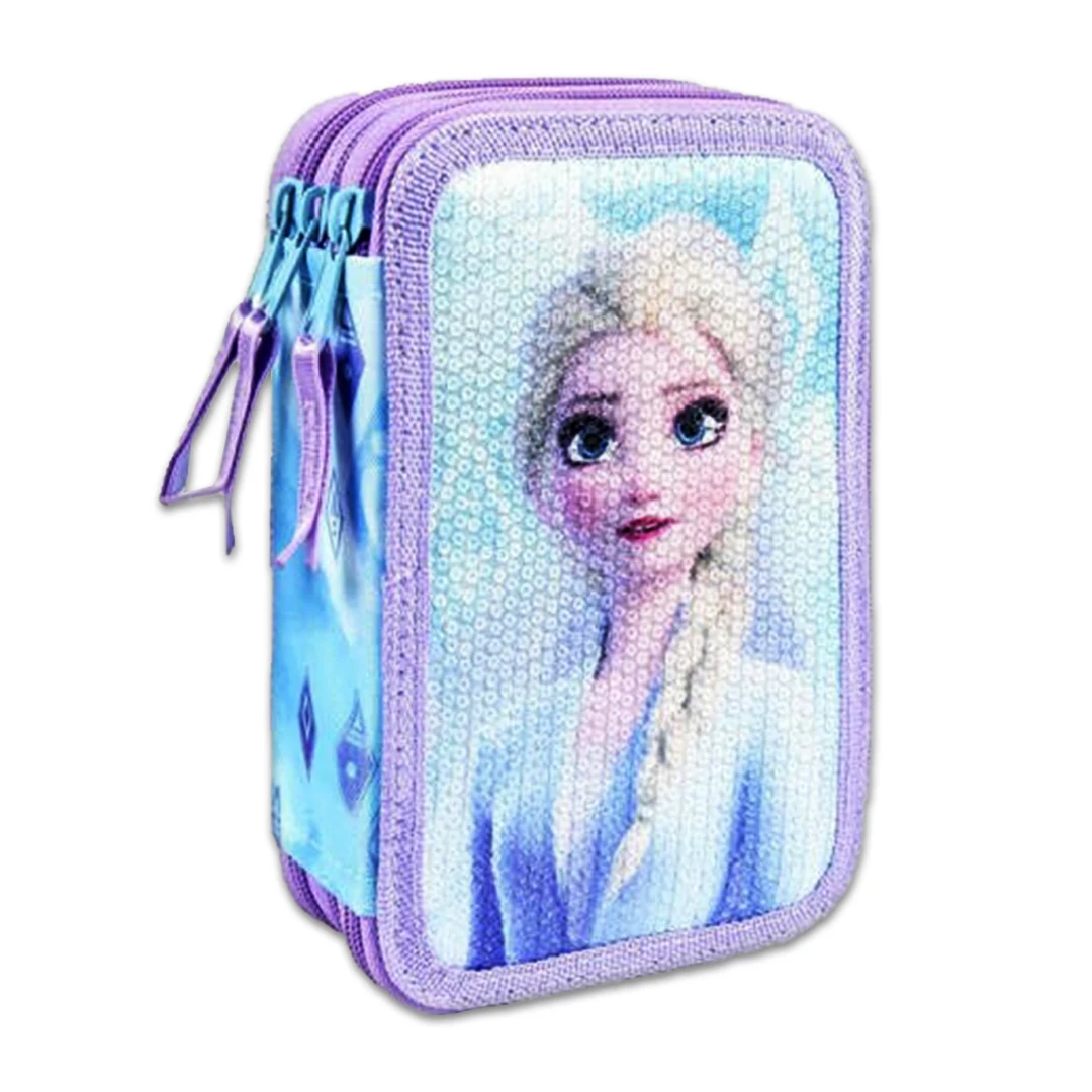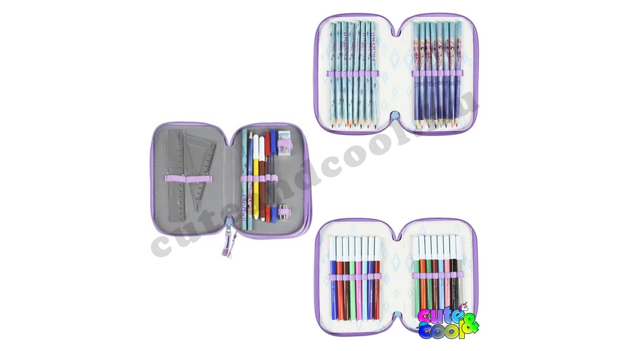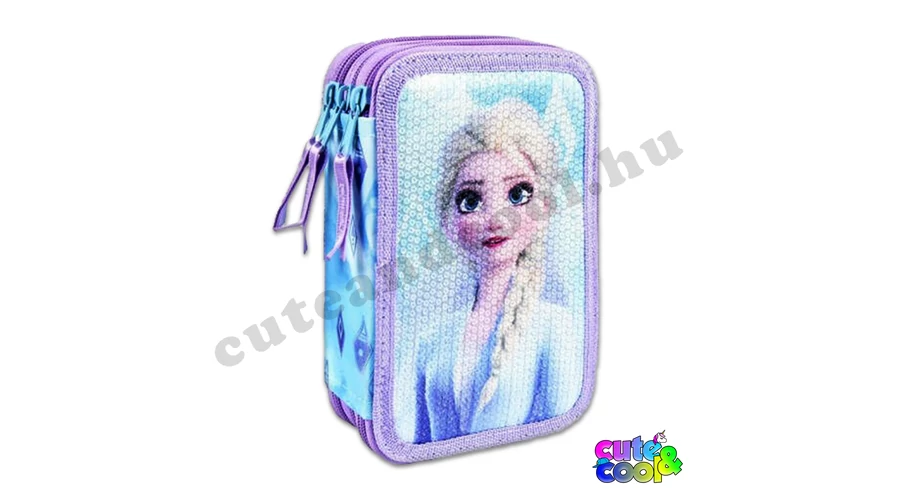 Három emeletes, Jégvarázs tolltartó Elzával díszítve. Minőségi Giotto márkájú íróeszközökkel töltve; grafitceruza és színesceruzák, hegyező, radír, tollak, és még vonalzók is. Ebben a tolltartóban könnyedén rendben tudod tartani az íróeszközeid!