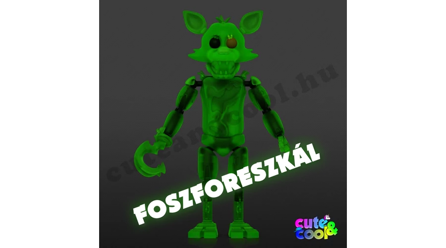 Az éjszakát csak az ügyességed révén élheted túl! Használd ügyesen és takarékosan az áramot, hogy Foxy, a kalózróka el ne kapjon a Five Nights at Freddy's játékban. Foxy az egyik robot állat aki le akar csapni rád. FNAF Foxynak külön színpada van, a Kalóz-öböl. Ő az egyetlen robot, akit mozogni látunk a kamerákon. FOSZFORESZKÁLÓ DESIGN A Funko játékfigura karjai, lábai, nyaka mozgatható, így beállíthatod olyan testhelyzetbe amibe szeretnéd. A részletesen kidolgozott figura egy az egyben hasonlít a sorozatban szereplővel.