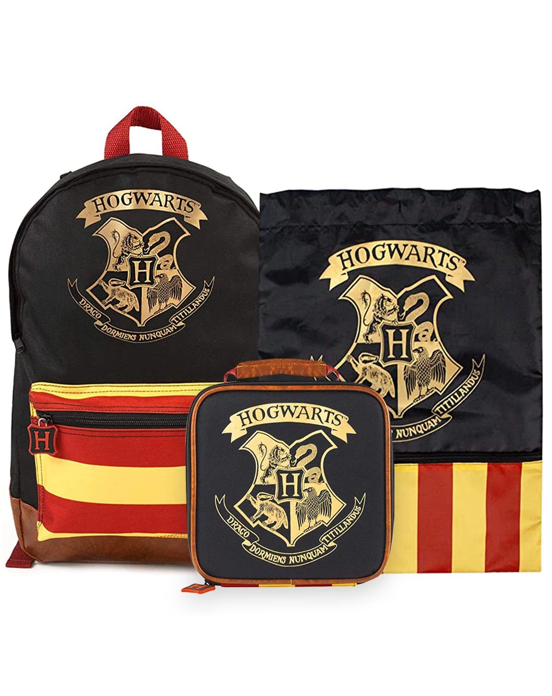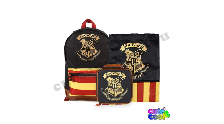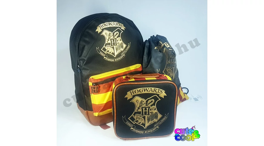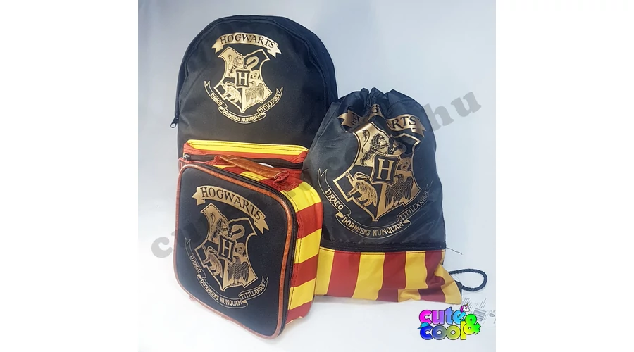 - 3 pieces Hogwarts kids school bag set - including: school bag, lunch bag, gym bag - red-yellow design with gold logo of Hogwarts - premium quality - cool, massive, durable - large backpack: one big compartment and one pocket on the front with zip closure, adjustable padded shoulder straps, padded back - lunch bag: insulated food container with zip closure - Gym bag / Swim bag with one pocket with zip closure - color: black, red, yellow