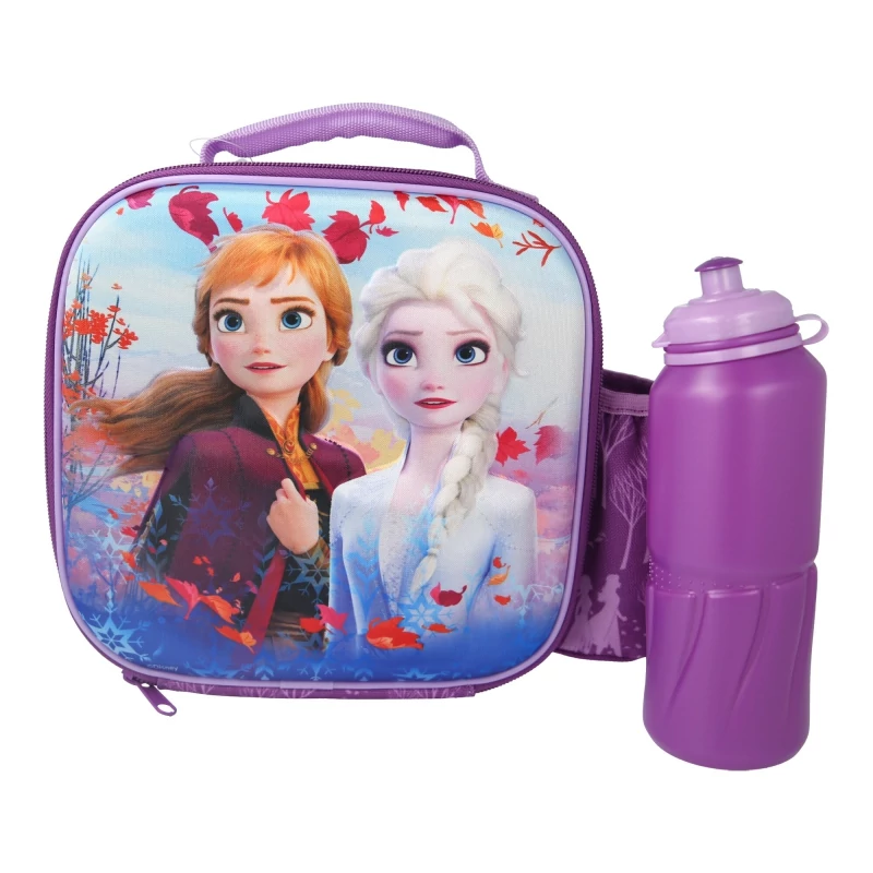 - 2 pieces lunch bag set - Frozen tale design - premium quality - massive, durable - zipped and insulated food container - water bottle doesn't leak - featuring Elsa and Anna
