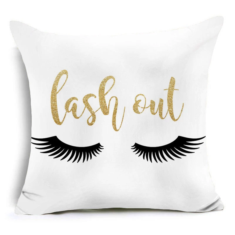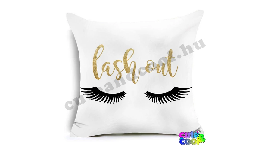 Finoman elegáns, szempilla mintás, arany hatású felirattal díszitett párnahuzat, ami tökéletes dísze lesz a lakásnak, de akár kozmetikának vagy szempilla szalonnak is.