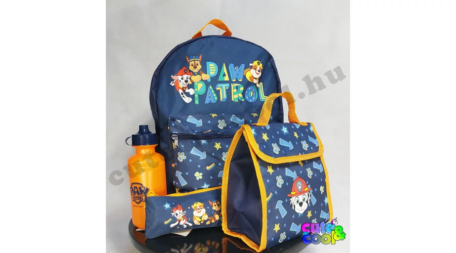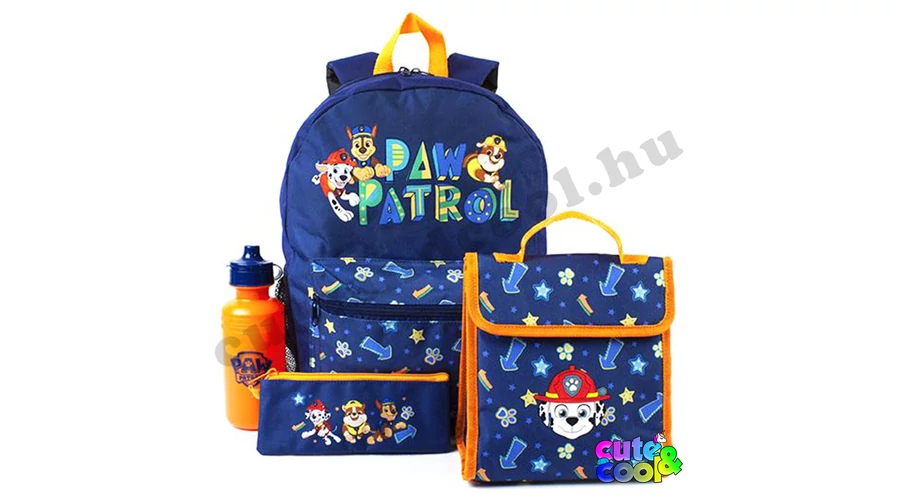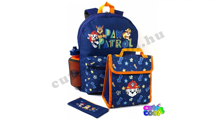 Minden amire a kis Mancs Őrjárat rajongónak szüksége van egy iskolai napokra! Ez az 4 darabos hátizsák készlet fantasztikus módja annak, hogy felkészüljön az iskolára. A készlet a sötétkék-narancs kombinácíó Chase-vel, Marshall-al és Rubble-vel. A hátizsák elején nagy cipzáros zseb, illetve egy nagy rekesz. Állítható, szivacsos vállpánt. Külsején a Paw Patrol felirat, oldalán egy kulacstartó hálós zseb. A szigetelt uzsonnás táskába szinte minden belefér. A szett tartalmaz egy Mancs Őrjárat logós zárható kulacsot és egy cipzáros ceruzatartót.