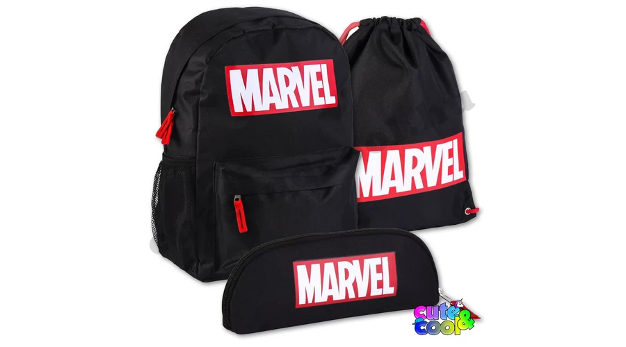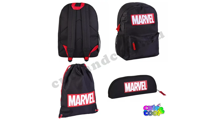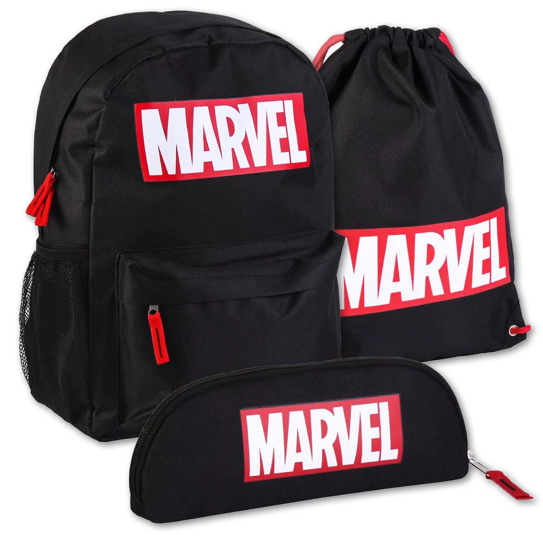 Marvel univerzum iskolatáska szett, ami 3 darabból áll, egy nagyméretű iskolatáskából, egy erős tornazsákból és egy tolltartóból. Mindegyik fekete  alap színű, rajta a hivatalos MARVEL logó. Az iskolatáska 40 x 28 x 13 cm-es, elfér benne minden tankönyved. Egy cipzáros főrekesze és egy cipzáros elülső zsebe van, oldalán egy gumis, hálós zseb van. Az iskolatáska anyaga erősebb poliészter, háta vékonyan párnázott, vállpántjai állíthatóak. A tökéletesen passzoló tornazsák 39 x 30 cm nagyságú, kimondottan erős anyagú és vastag zsinórral rendelkezik. A tolltartó egyszerű, cipzáros zárású ahova a legszükségesebb írószereidet helyzheted.