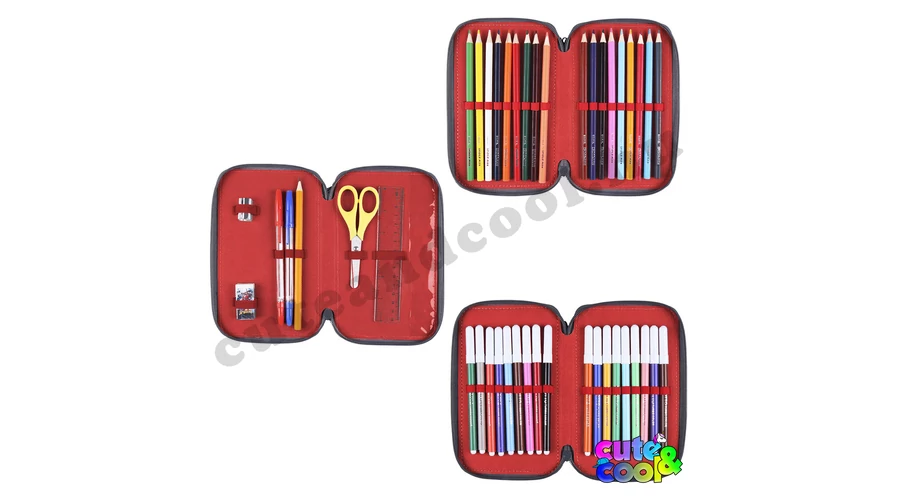 Anyaga: 100% poliészter Méret: 20 x 13 x 6 cm Tartalma: - 17 db színes ceruza - 18 db színes filctoll - 1 db grafit ceruza - 1 db hegyező - 1 db radír - 1 db kék toll - 1 db piros toll - 1 db vonalzó - 1 db olló