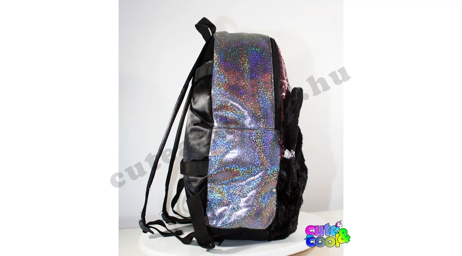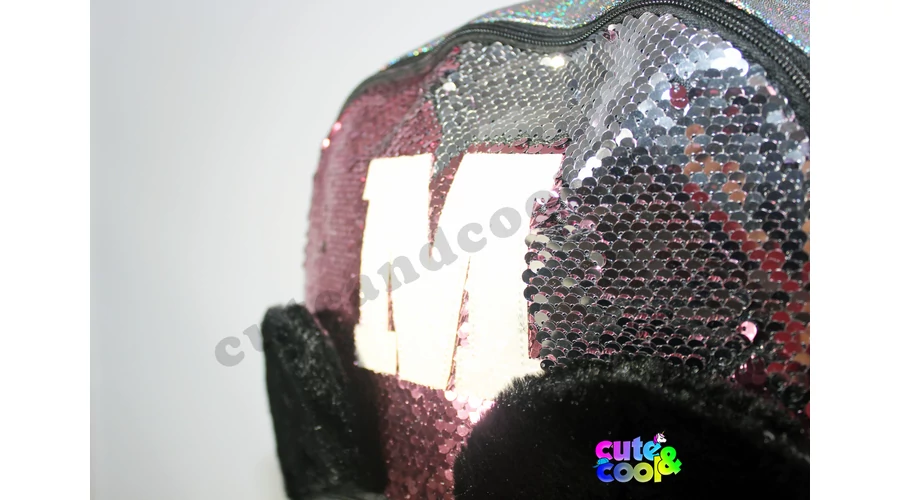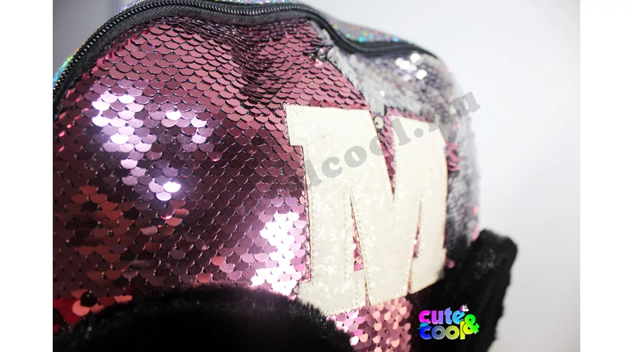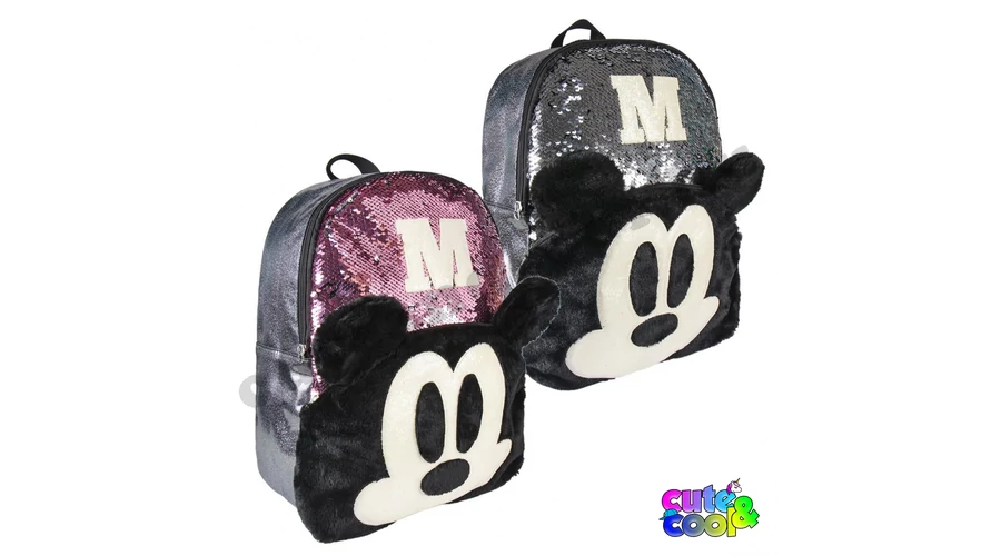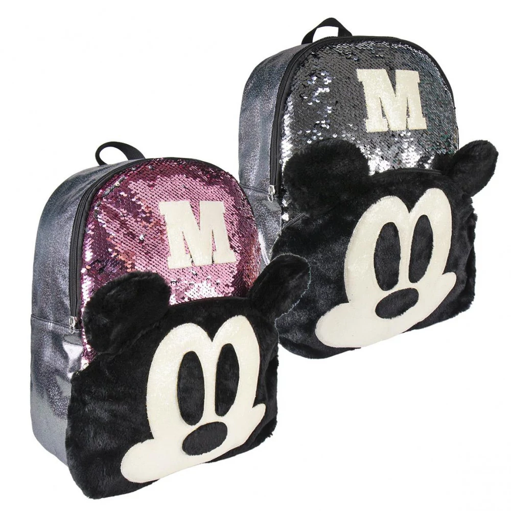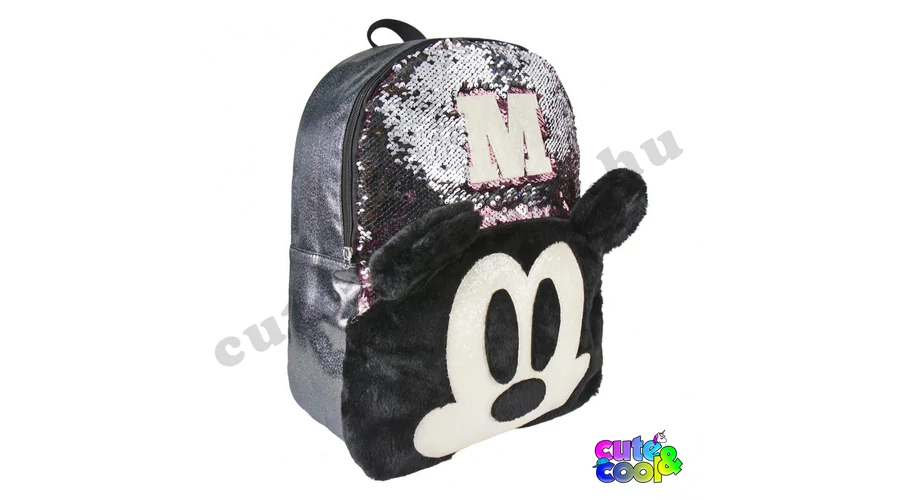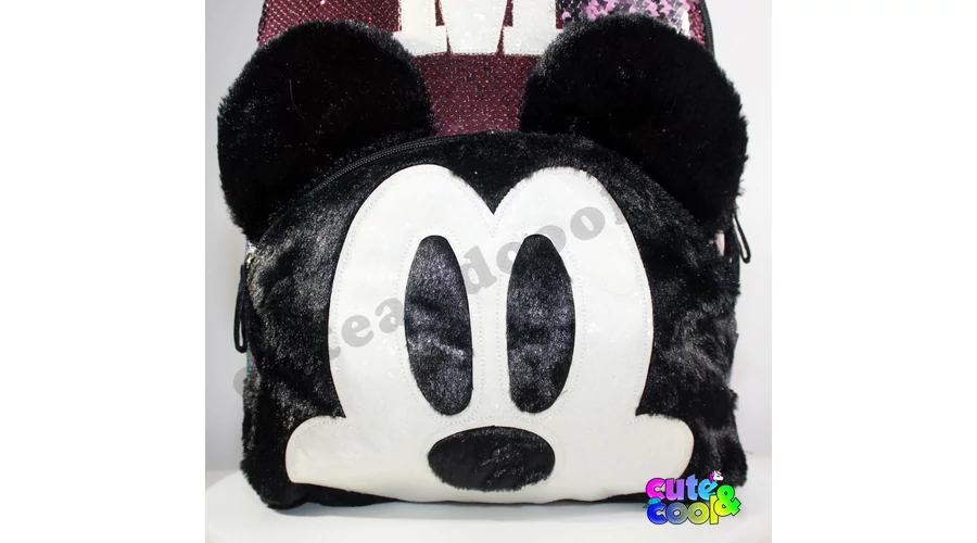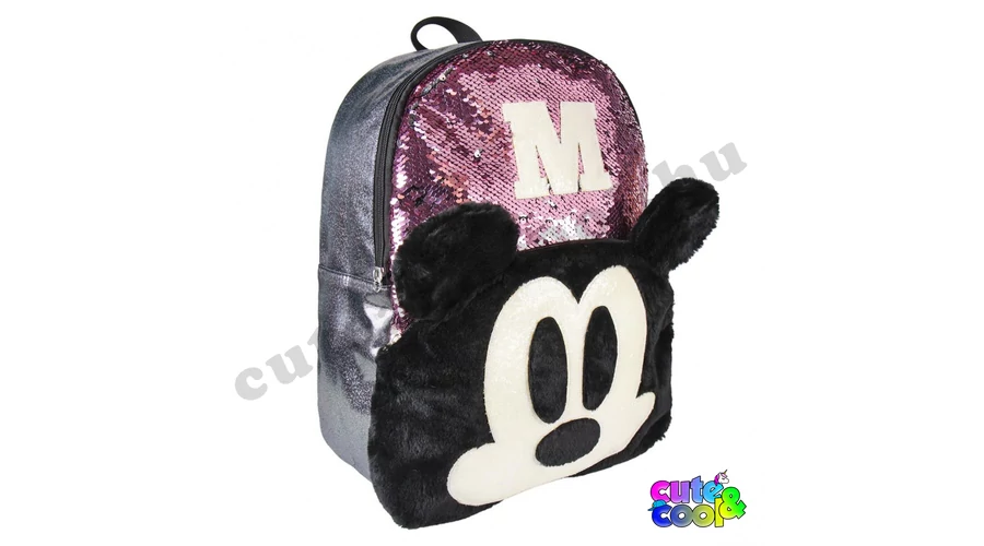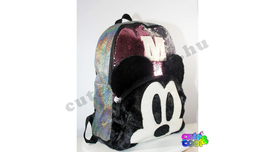 - big-sized Mickey Mouse sequin backpack - premium quality - sequin pink to silver - Mickey Mouse head from plush - simple, massive, durable - two comparments with zip closure - padded back - adjustable padded shoulder straps - featuring M and Mickey's head from Disney tale