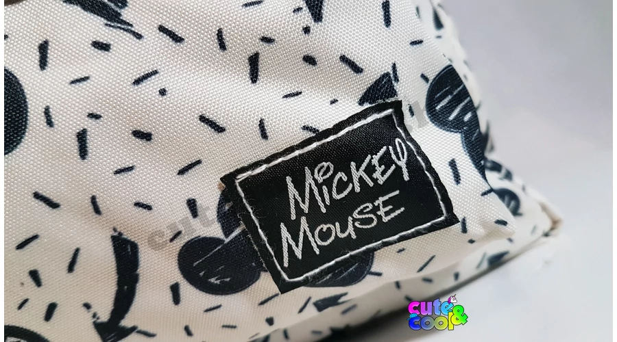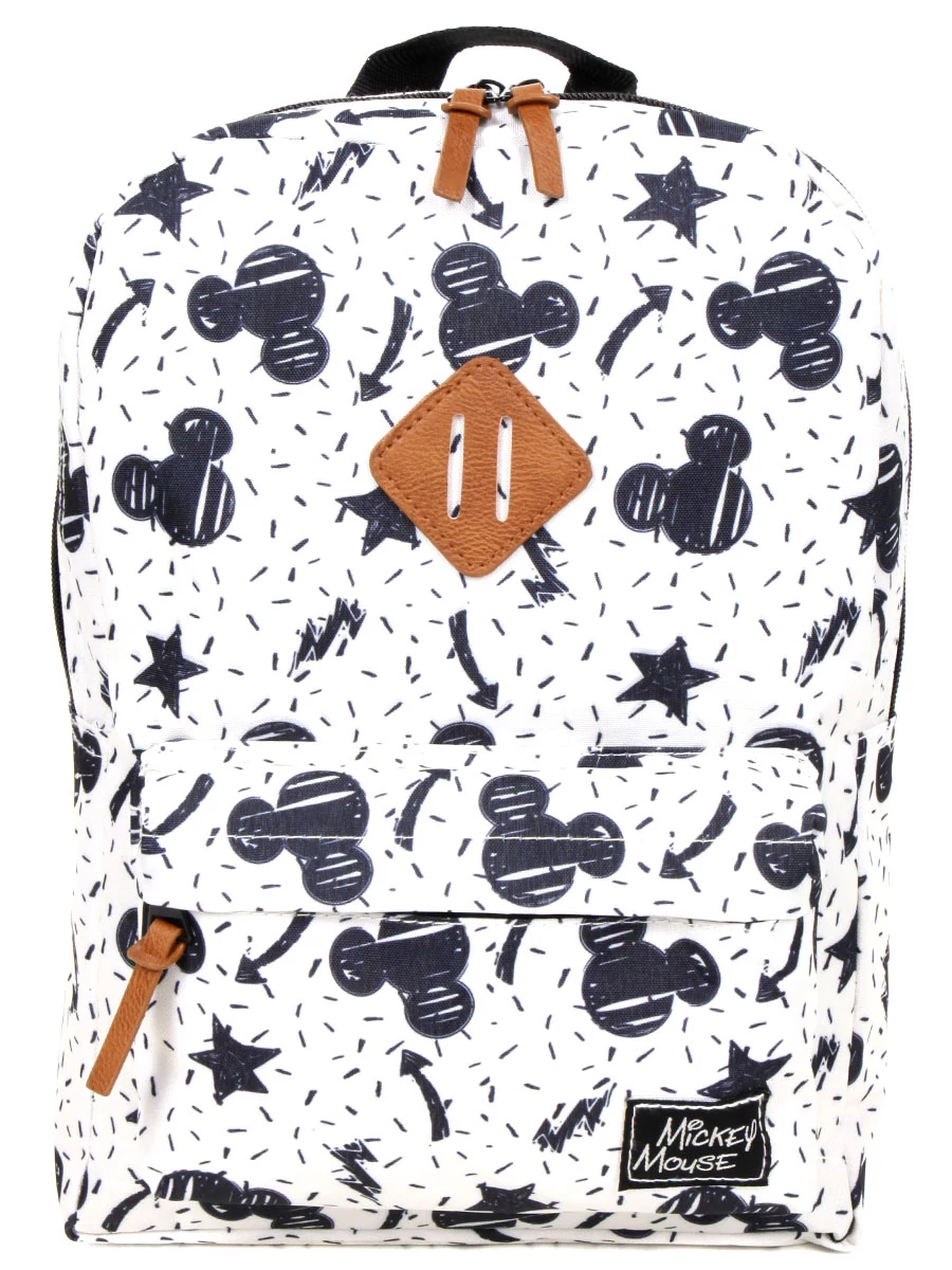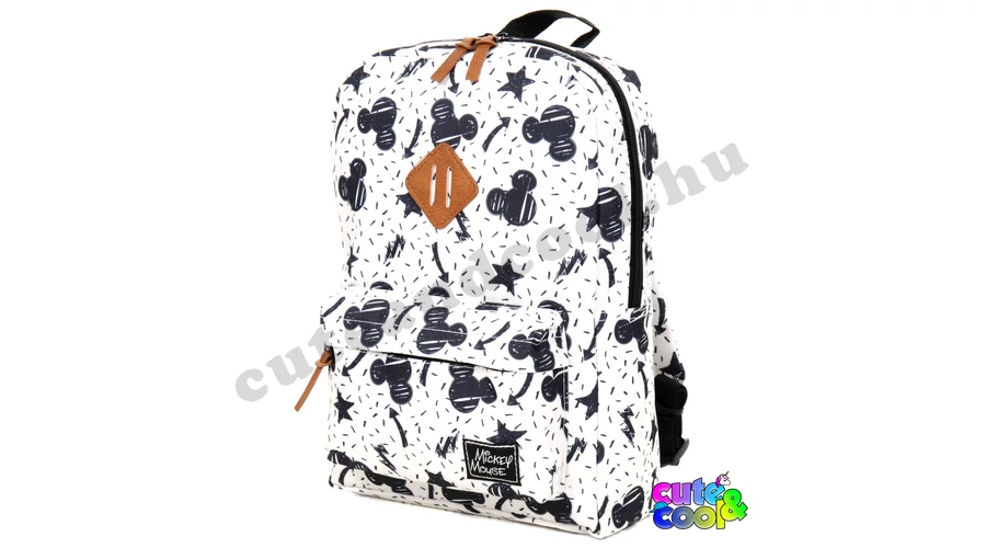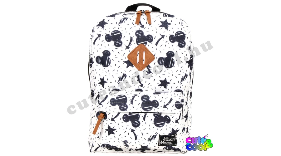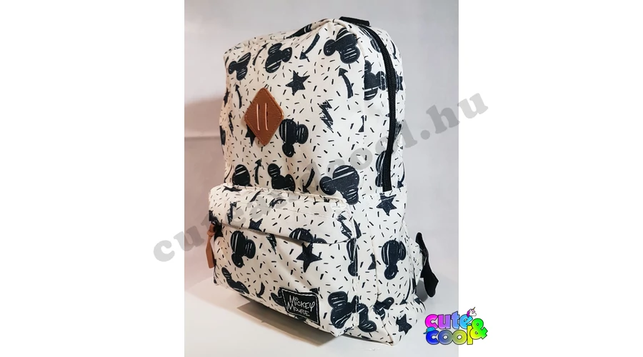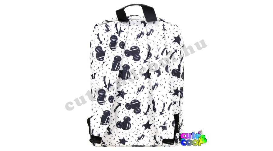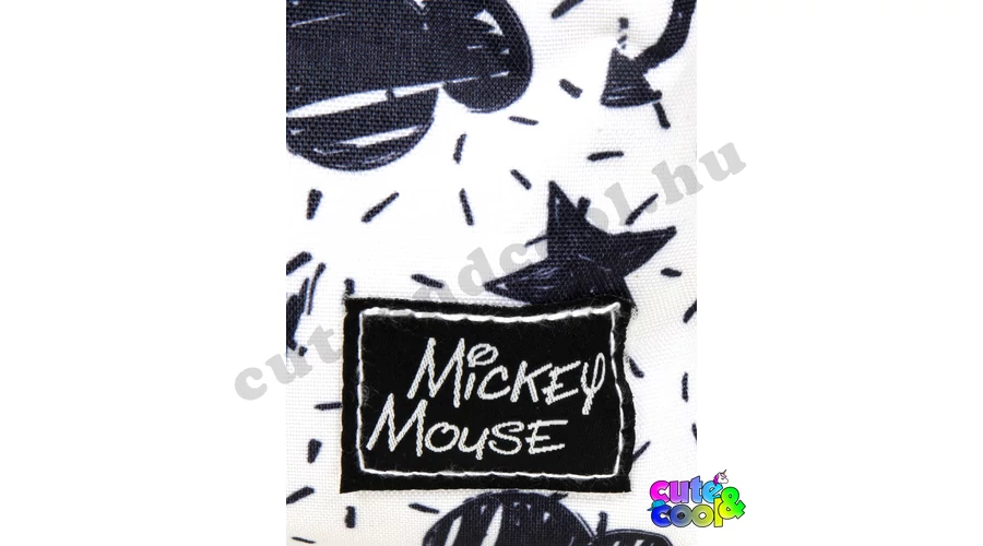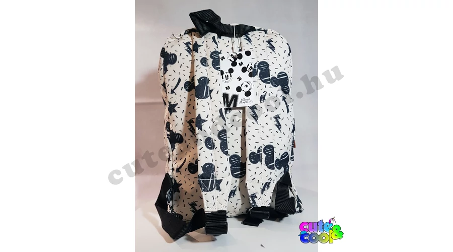 Vagány fekete-fehér Mickey Mouse mintás hátizsák,egyterű, elején nagy méretű cipzáros zsebbel, állítható párnázott vállpántal.