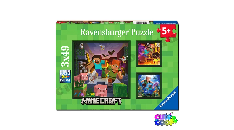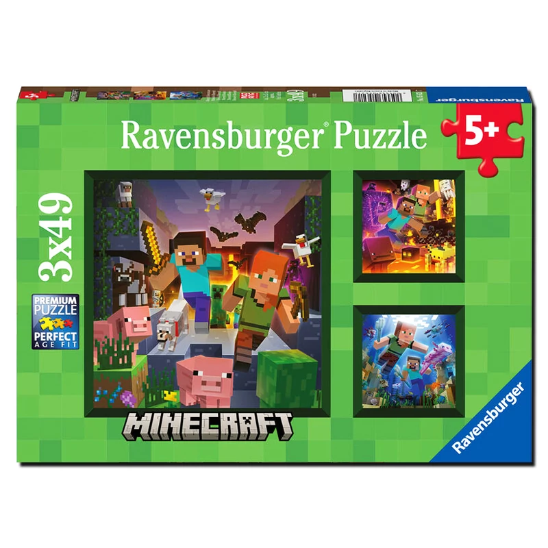 Three Minecraft puzzles in one box from Ravensburger. The puzzles showcase three different locations from the Minecraft world: the Nether, the Overworld, and the Ocean. The 49-piece Minecraft puzzles are vibrant and high-quality, with large-sized pieces that fit together perfectly, making them suitable for kids as young as 5 years old. These Minecraft puzzles are perfect for beginners!