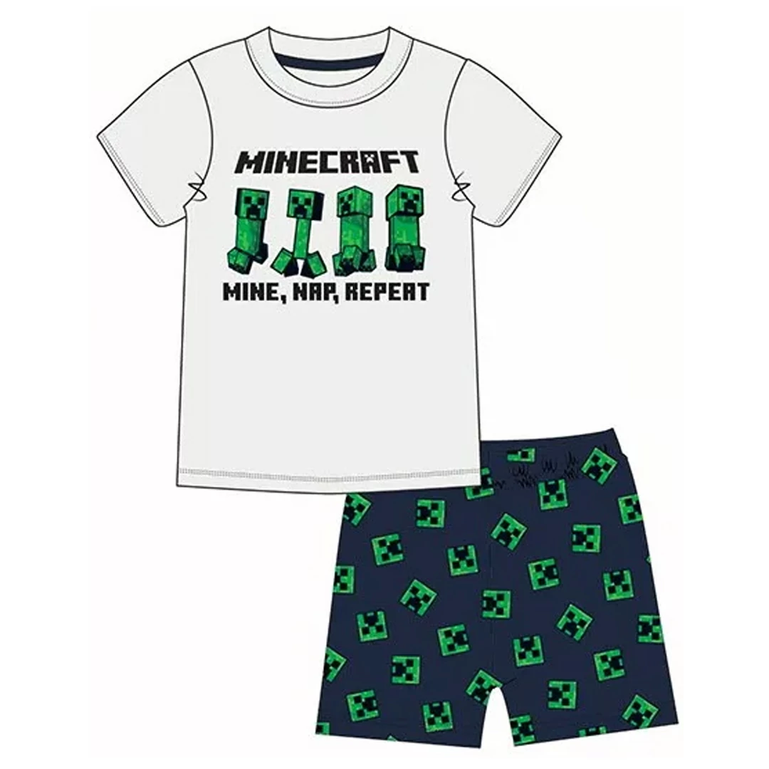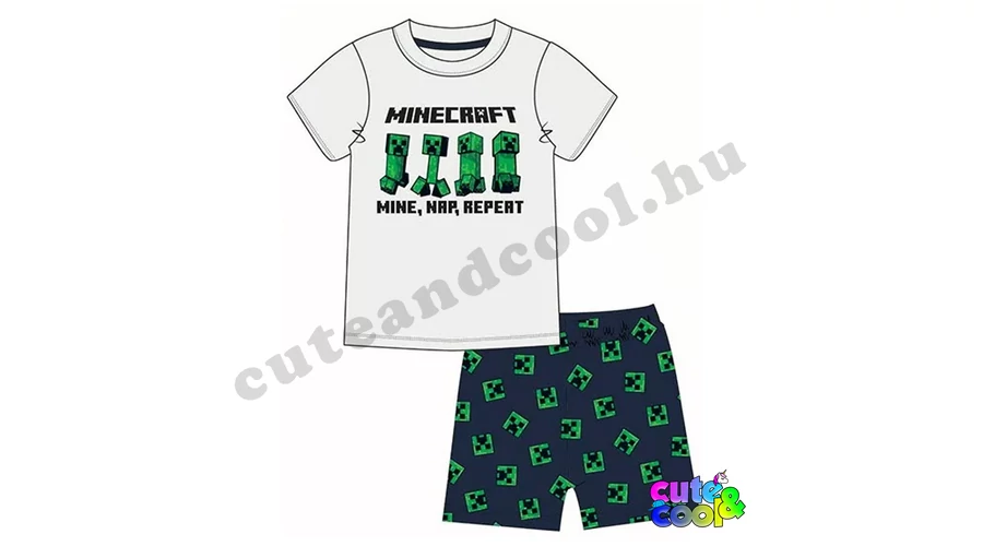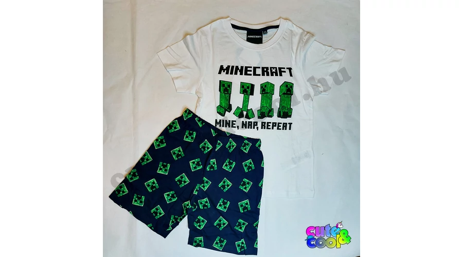 Minecraftos fehér rövid póló és sötét kék Creeper fejekkel diszített rövid gatya, a pizsama szett tartalma. A fehér pamut felsőn 4 Creeper szörnyet láthatsz, és a Minecraft játék nagy igazságát: Mine, (bányász) Nap, (pihenj) Repeat (ismételj). A nadrág dereke gumis és anyaga 95% pamut a kényelmes viseletért, jó szellőzésért. Creepereket legyőző, bátor Minecraft harcosoknak ajánljuk ezt a szuper pizsamát!