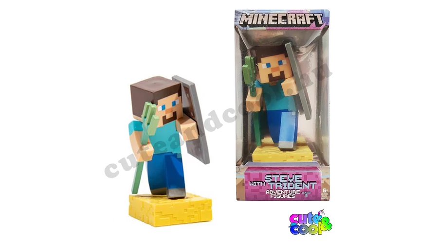 A Minecraft főszereplője, a karakter akit irányítasz lehet most a tied! Steve egy háromágú szigonnyal (trident) és egy pajzzsal a kesében oson ovatósan a parton. A figura 10 cm magas, minőségi kidolgozottásgú, hogy tökéletes mása legyen a játékban szereplőnek.