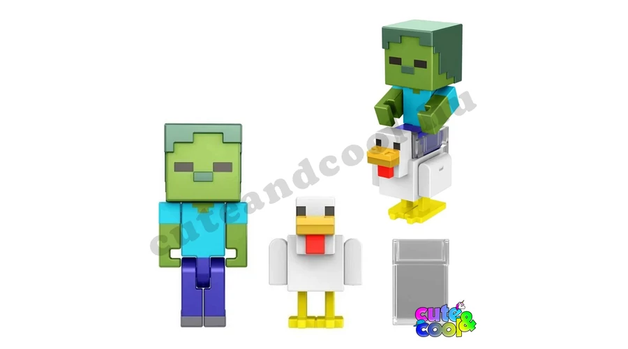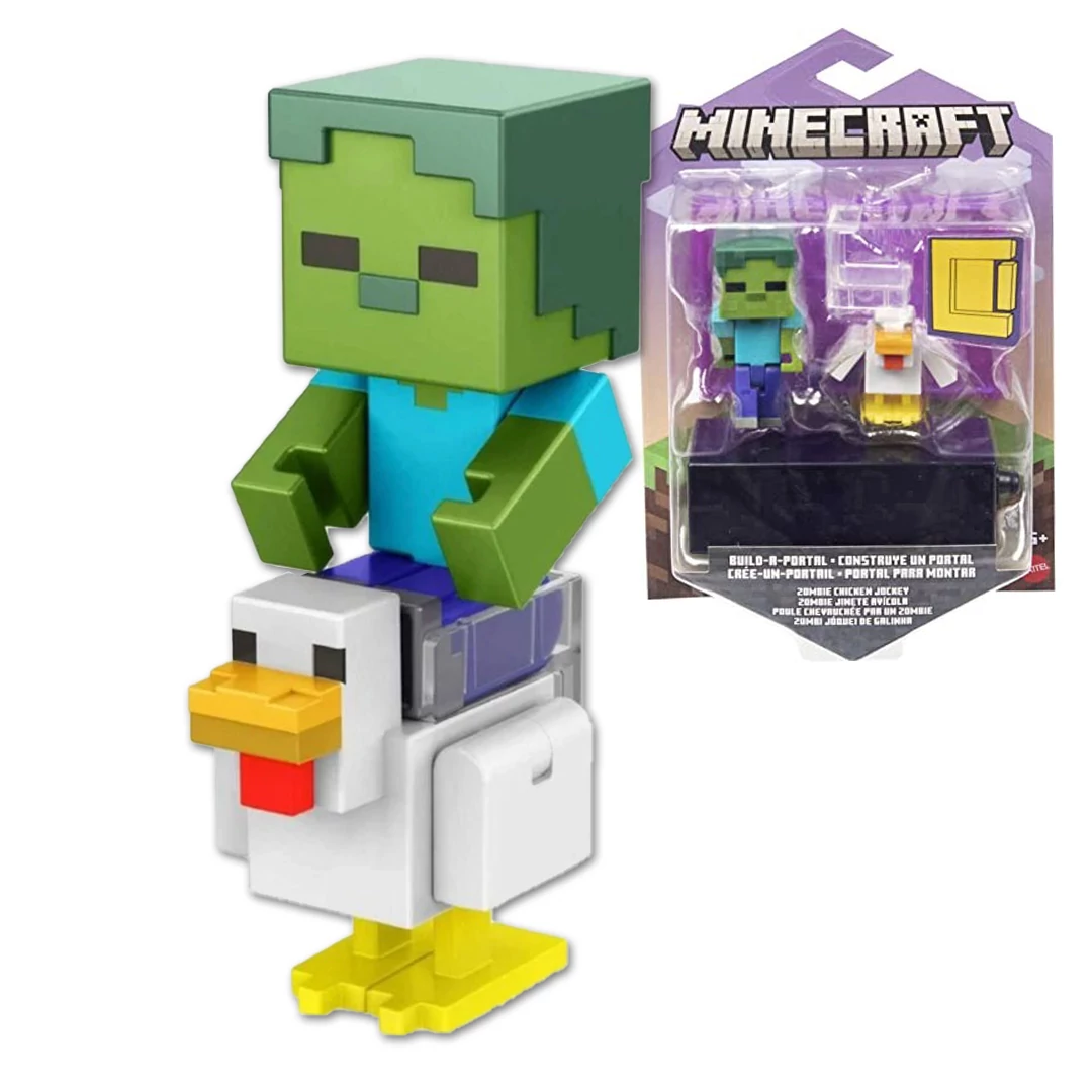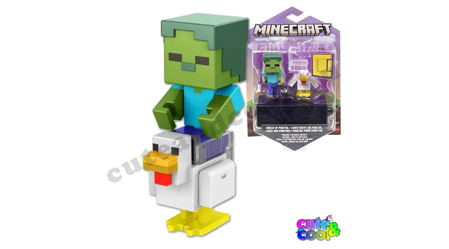 Te már találkoztál csirkén lovagló bébi zombin? Igen ritka, de feletébb vicces a csirke zsoké zombi. A Minecraft világához mérten hitelesen kinéző, pixelezett műanyag játékfiguráért a rajongók odalesznek. A kis zombi lábai, karjai, a csirke szárnyai mozdíthatóak. A kicsi zombi és a csirke mellett egy "nyereg" is van. A dobozban van még egy nagy obszidián blokk, - amit összerakva kirakhatod a Nether kaput - ha összegyűjtöd a többi különböző játékfigurát is.