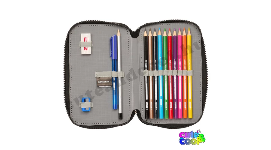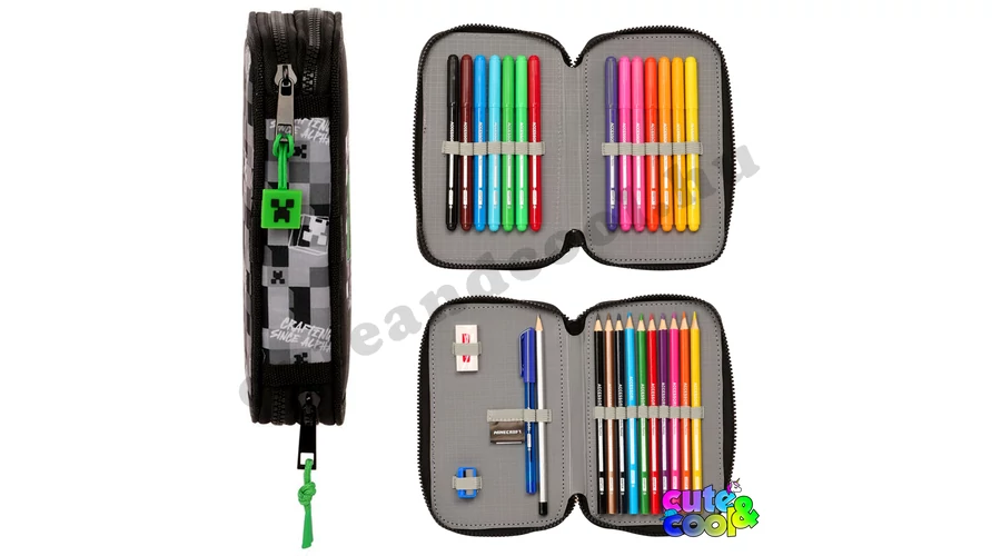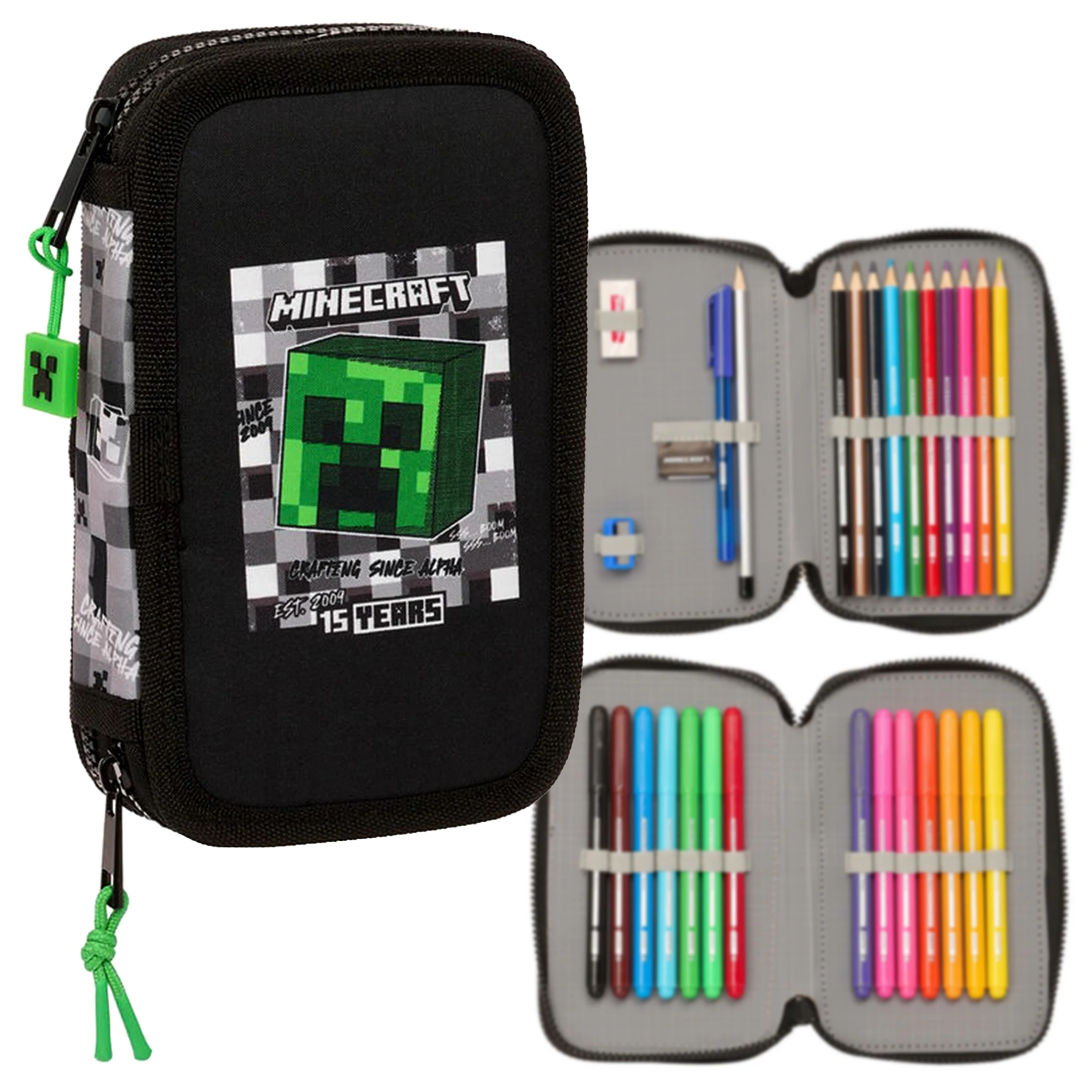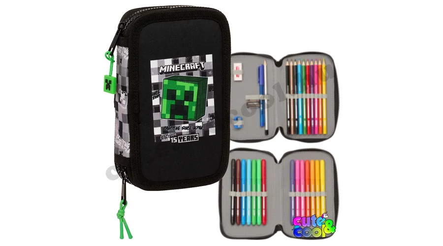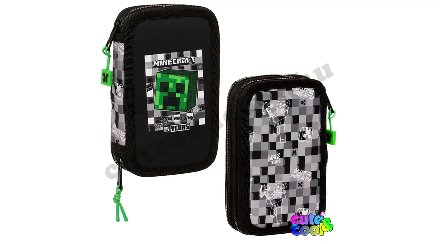 Szuper két cipzáros, emeletes Minecraftos tolltartó a zöld szörnnyel a Creeperrel diszítve. A Minecraftos tolltartó töltve van Safta márkás írószerekkel, mint; 1 db radír, 1db grafitceruzá, 1db hegyező, 1db toll, 10 db színes ceruza és 14 színes filc. A tolltartó "kockás" desing-ja és a "Crafting since Alpha" utal a játék 15 éves jubileumára. A praktikus Minecraftos tolltartó könnyen futó cipzárain Creeper fejek lógnak. Ebben a Minecraft tolltartóban rendezetten tudod tartani a ceruzáid, írószered. Tökéletes választás elsősöktől kezdve felsősökig! Limitált készlet