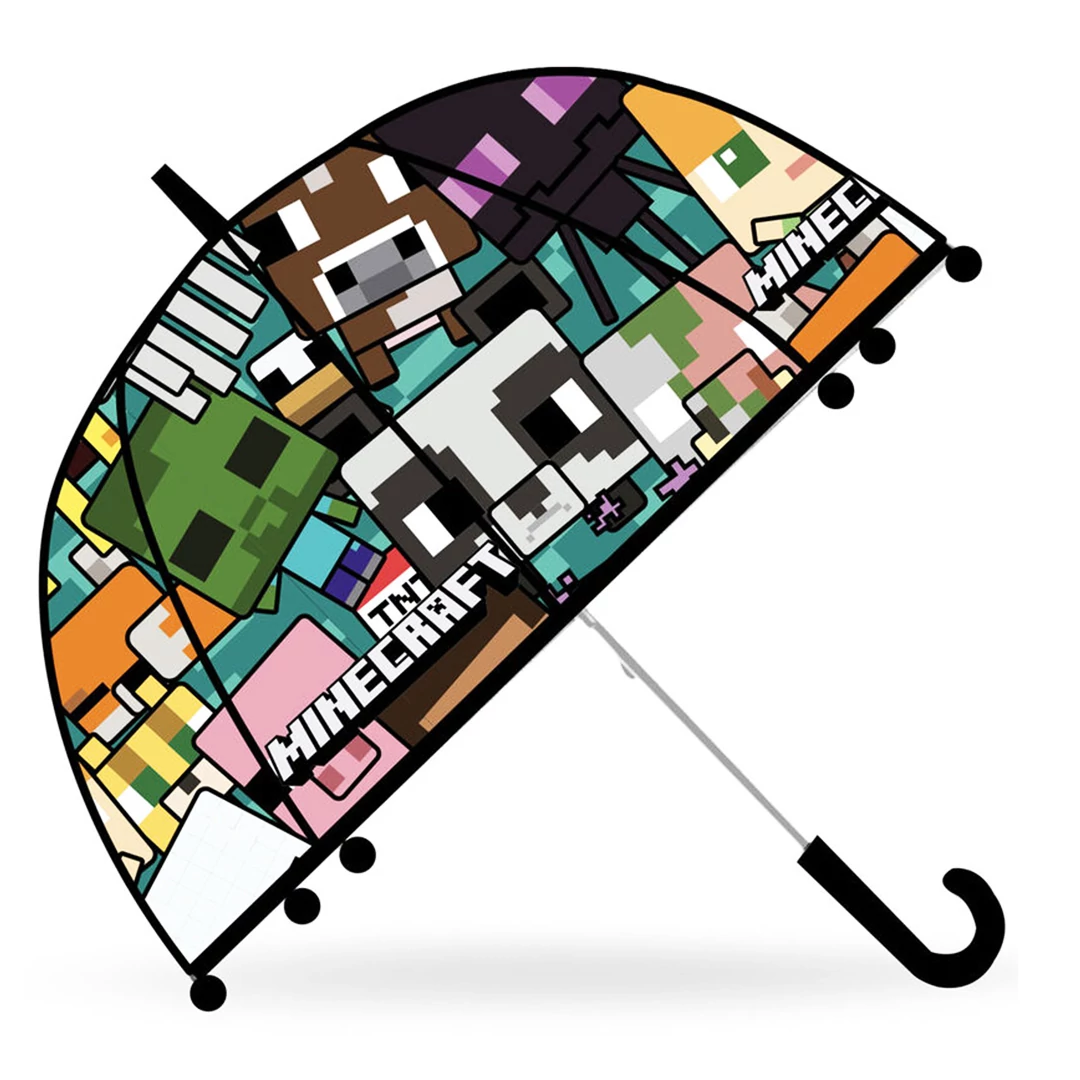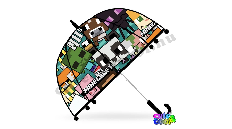 Minecraft mintás gyerek esernyő cuki Minecraft karakterekkel! A könnyen és biztonságosan használható ernyő gombbal nyitható ki, összecsukáskor patenttel lehet lezárni.A cuki figurák között megtalálod a Minecraft világából jól ismert arcokat mint például a zombi, malac, panda és enderman.