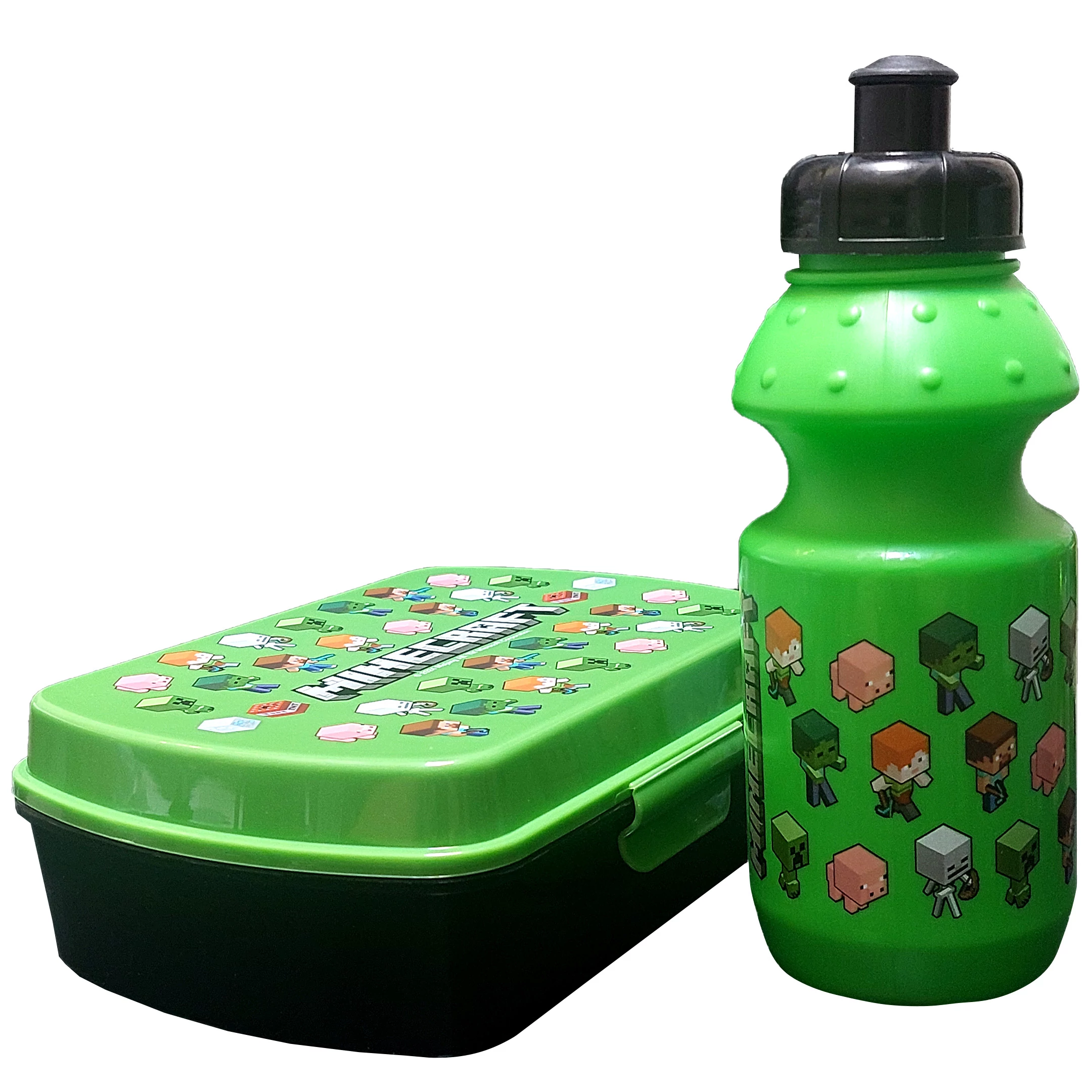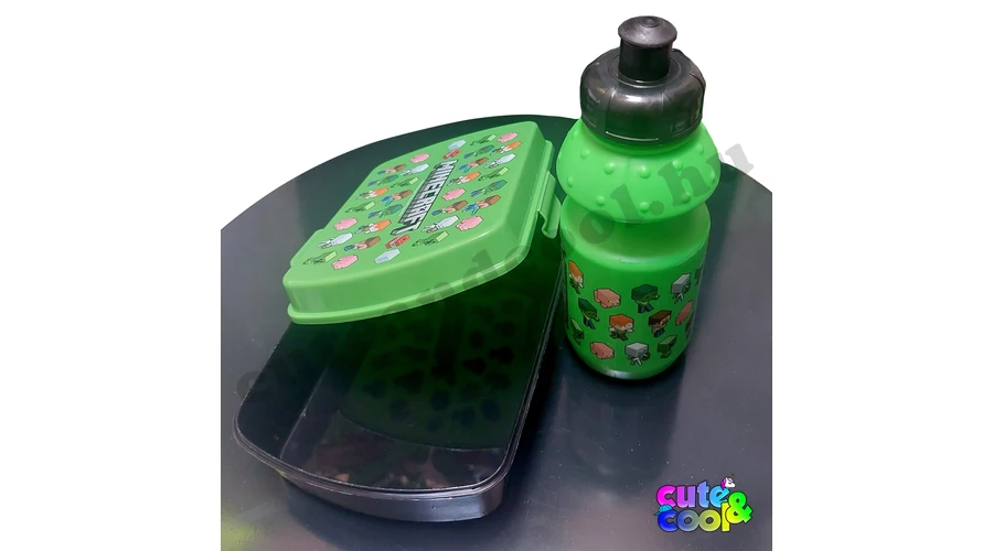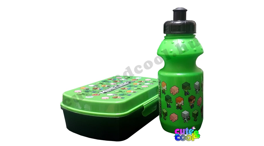 Minecraft cuki karakterekkel díszített műanyag ételtartó szendvicsdoboz és kulacs. A Minecraftos uzsonnásdoboz kényelmesen belefér a táskába mert 17 x 12 x 6 cm méretű, könnyen tisztítható, fedele teljesen levehető a pattentokkal. A palack 350 ml űrtartalmú, csőre kihúzható típusú, tisztításra, utántöltésre fedele lecsvarható.