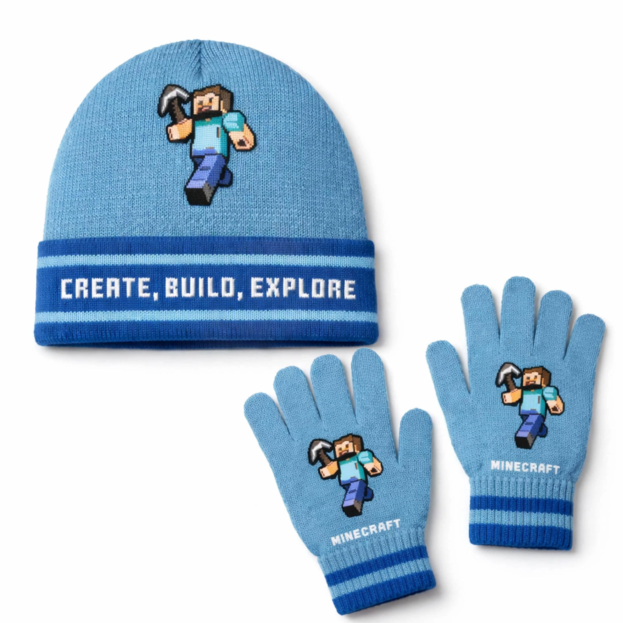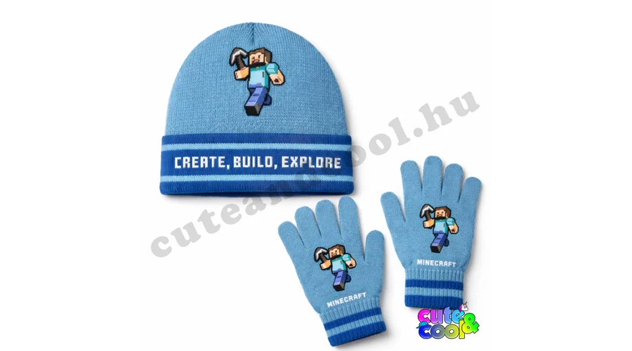 Fedezd fel a Minecraft világát ezzel a gyémántkék gyere sapka és kesztyű szettel! A sapkán büszkén ragyog a "Create Build Explore" felirat, ami a Minecraft jelszavait hordozza. A kesztyűkön és a sapkán Steve is látható, ahogy kezében tartja a híres csákányát. Stílus és kényelem a Minecraft rajongók számára!