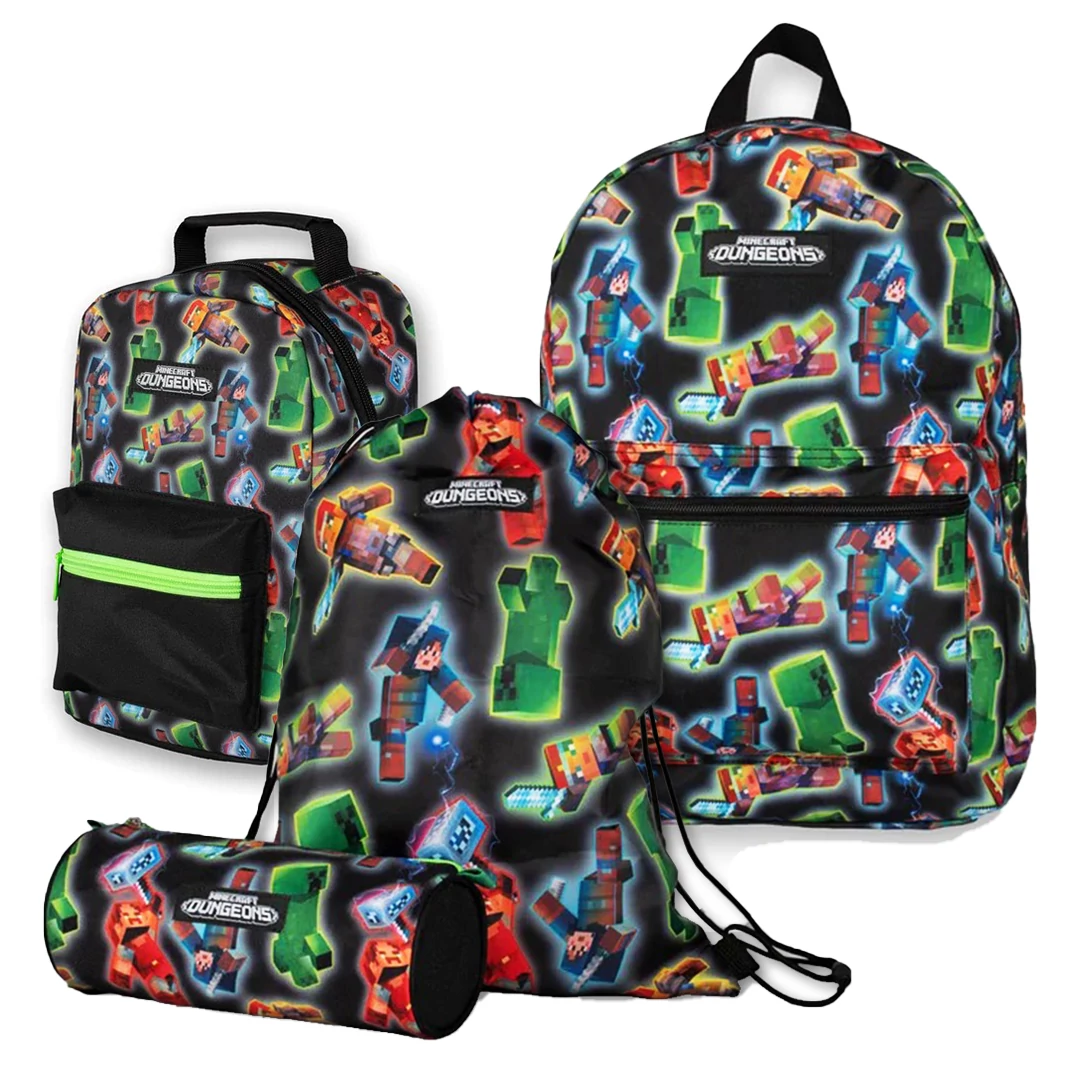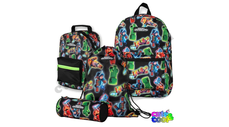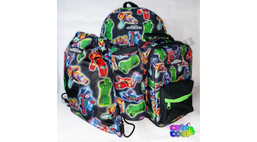 Vividly colored Minecraft Dungeons themed school backpack with a pencil case and gym bag. All three have the same pattern; on a darker base color, the colorful characters of Minecraft Dungeons add flair to the backpack set. The original Minecraft Dungeons logo can be found on each part. Overall, the impressive Minecraft backpack set is sure to catch the eye!
