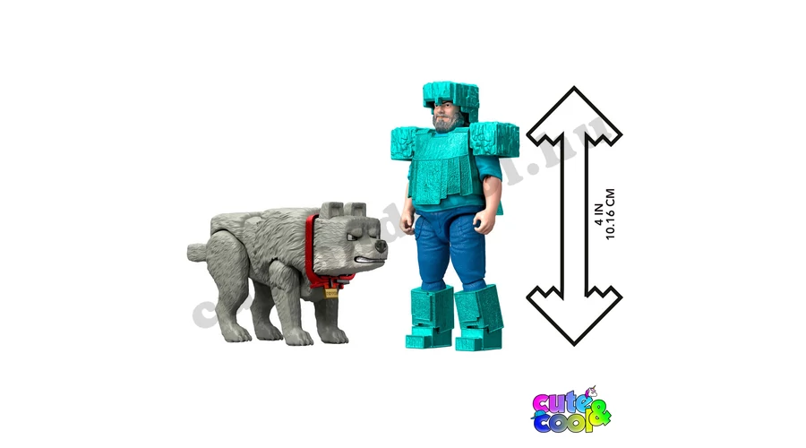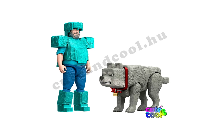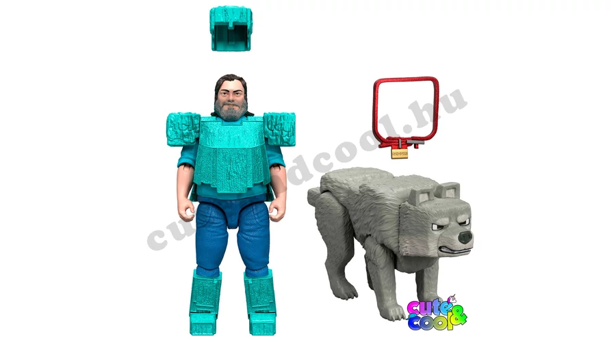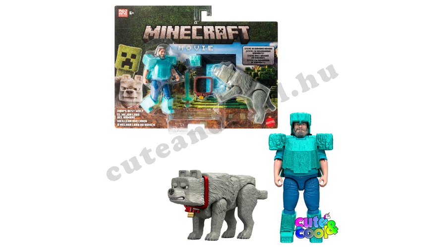 Az Egy Minecraft film főszereplője Steve (Jack Black) és társa a farkaskutya figurát most haza is viheted! Steve gyémántpáncélban, kezében egy gyémántkarddal, a farkasnak saját nyakötve van névtáblával.  A játékfigurák kezei lábai mozgathatóak, kezükbe lehet adni a tárgyakat.