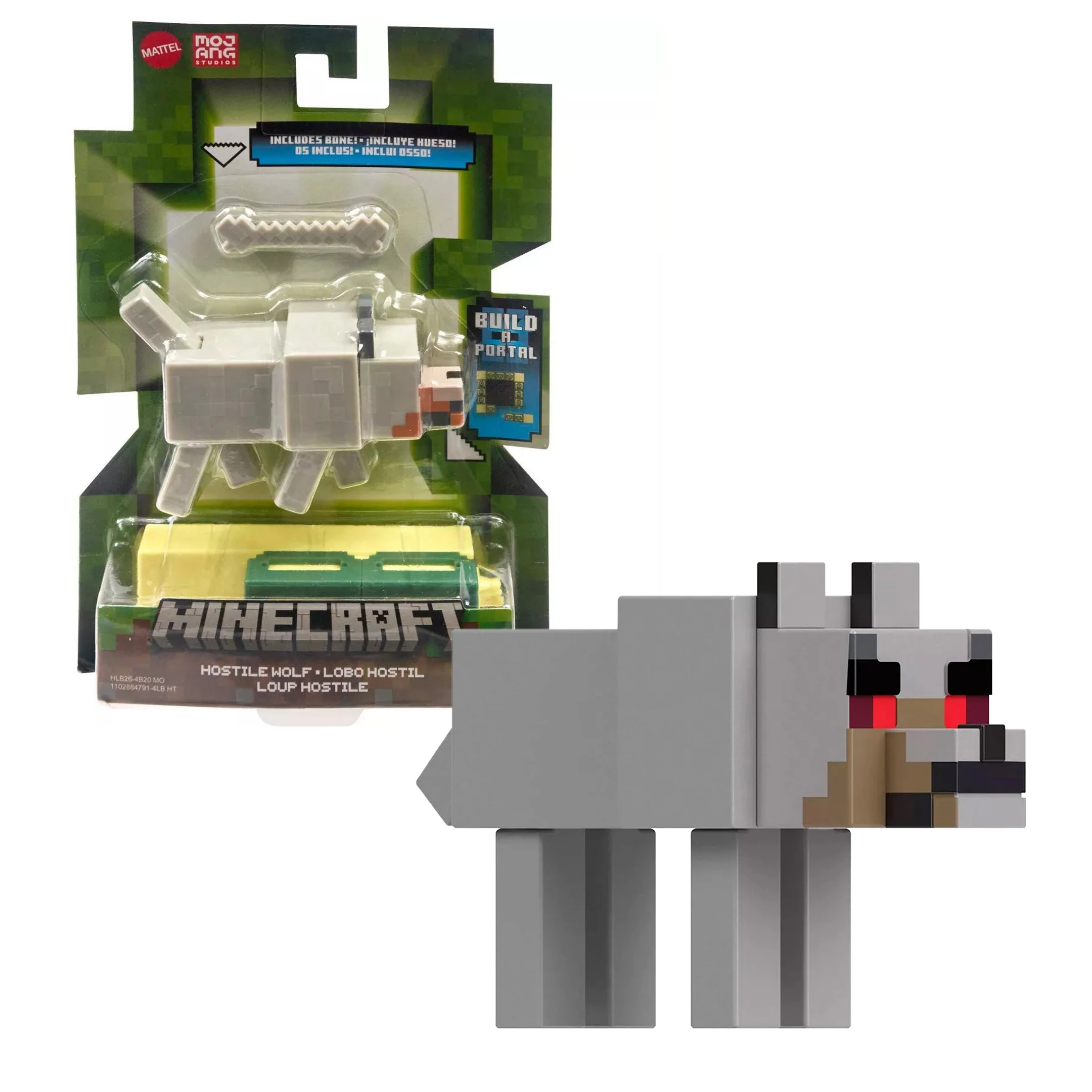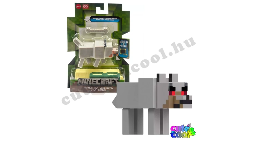 A hitelesen, pixelezett Minecraft farkas műanyag játékfiguráért a rajongók odalesznek. A Minecraftban a farkasból szelidíthető, barátságos kutyává váló mob az egyik leghasznosabb élőlény, aki minden erejével védelmez téged, de ez a farkas még vadonélő, a szemein is látni. A játékfigura lábai, farka mozgatható. A doboz tartalma a farkas, egy csont, illetve egy blokkot amit a többi szett összegyűjtésével együttesen egy End portált képeznek.