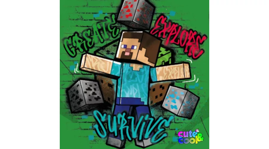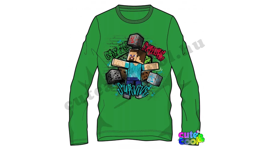 Élénk zöld színű, hosszú ujjú Minecraftos gyerek póló. Menő graffitis stílusban Steve és blokkok láthatóak a Minecraft jelmondatával a Creative - Explore - Survive. A póló minőségi pamut a kényelmes viseletért.