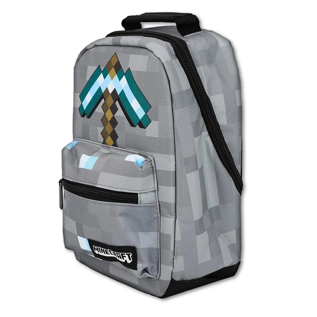 A large, premium quality Minecraft lunch bag. The grey pixelated background represents the stone block with scattered diamond ores, and it is adorned with Minecraft's most useful tool, the Diamond Pickaxe, along with the official Minecraft logo.