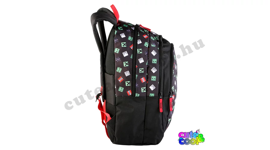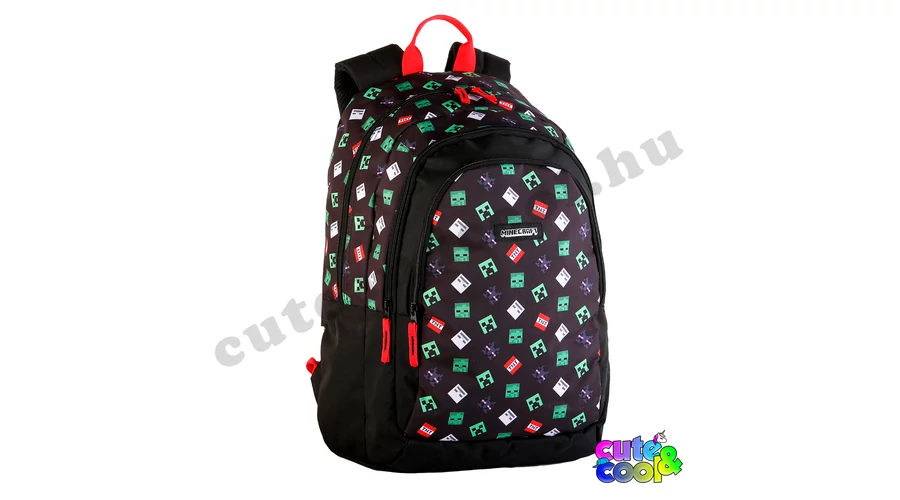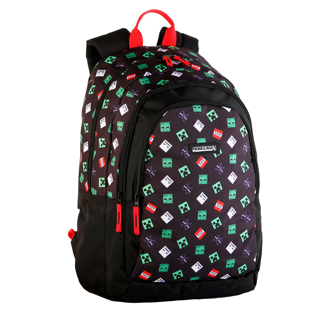 The Minecraft 3-compartment high-quality school backpack is an excellent choice for students. The Minecraft-themed backpack with three zippered compartments allows for easy organization and prevents books from scattering. The interior is fully lined and includes a separate laptop compartment for device protection. The thickly padded backrest and shoulder straps ensure maximum comfort during extended use. The backpack is made with high-quality craftsmanship and easy-to-use zippers that glide smoothly. The material has a pleasant touch and is extremely durable. The Minecraft school backpack is sturdy and spacious, measuring 40 x 30 x 20 cm, making it suitable for both elementary and middle school students. The appearance of the backpack is highly attractive, featuring prominent red accents on a black base and adorned with the faces of Minecraft's most recognizable characters, such as Enderman, Creeper, Zombie, and Skeleton. This backpack will undoubtedly become a favorite among children, who will proudly carry it to school.