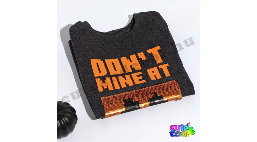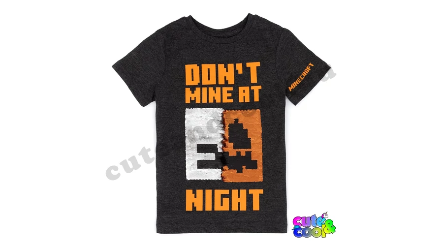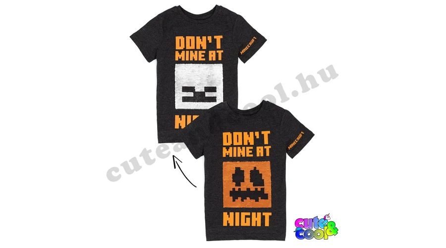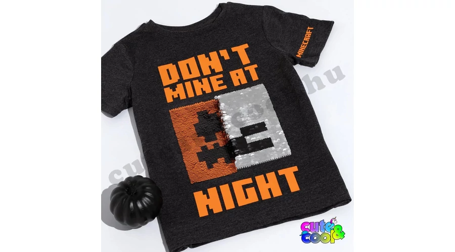 A narancs színű, tökfejű hógólem és a szürke íjász csonti arca jelennek meg a pólón. A flitterek egyik oldalán a Hógólem Tök arca, a flitter másik oldalán a Csontvázé, amit egy egyszerű simító mozdulattal át tudsz fordítani. A pólón a "Don't mine at night" felirat (fordítás: Ne bányássz éjszaka!) kicsit mókás, mert a barlangban mindig sötét van. A póló ujján a pedig a Minecraft felirat olvasható. A felső anyagának nagyrésze pamut ami kellemes tapintást, jól szellőzést, tartós színt garantál.