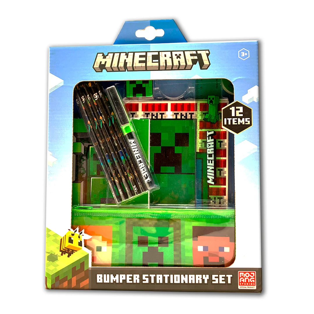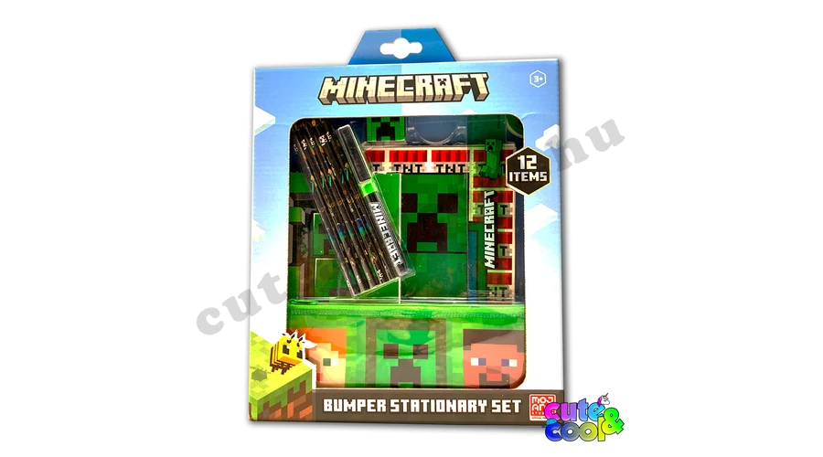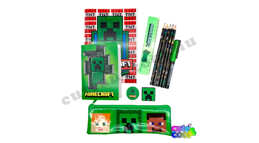 Super Minecraft school stationery set consisting of 12 pieces, each decorated with elements from the Minecraft world! It includes 5 colored pencils with Minecraft character patterns, an HB graphite pencil, a pencil sharpener with a Creeper face design, an eraser in the shape of a chest, and a green 15cm ruler. It also comes with an A5 and an A6 notebook, as well as a zippered pencil case featuring 3 Minecraft swords.