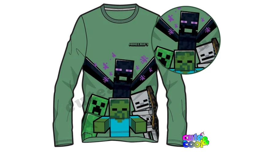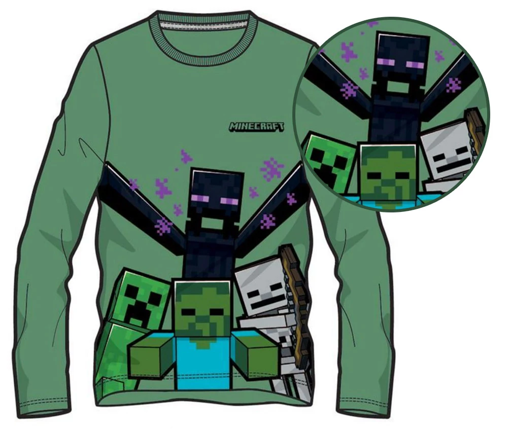 Világoszöld Minecraft mobos hosszú ujjú póló a játékból jól ismert veszélyes szörnyekkel, Enderman, Zombi, Creeper, Skeleton készen áll a harcra. A felső anyaga finom pamut a kényelmes viseletért.