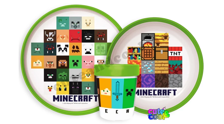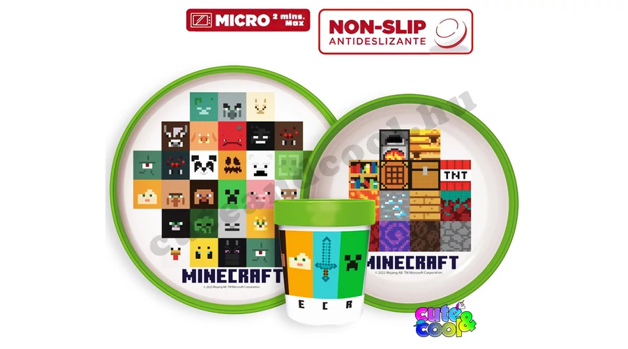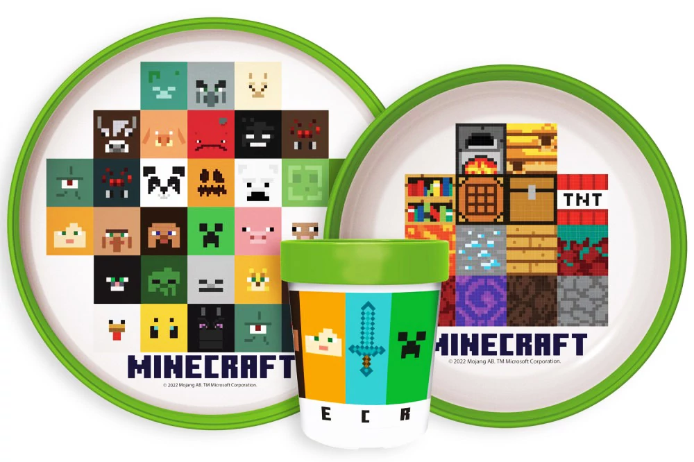 Minecraft skinekkel, blokkokkal, köztünk Steve-el és Alex-al és a félelmetes Mobokkal díszített 3 darabos étkészlet szett. Környezetbarát műanyag, 100% BPA mentes és mikrózható is!
