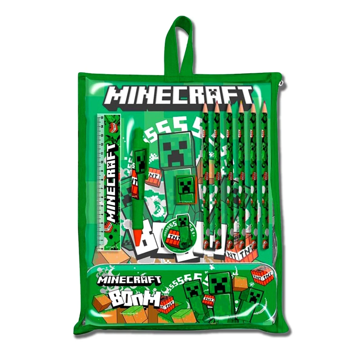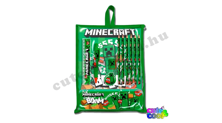 Szuper Minecraft iskolai írószer szett ami 12 darabból áll és minden része a Minecraft világ teremtményeivel van diszítve! Tartalmaz 6 db Minecraft karakter mintás színes ceruzát és egy tollat, egy füzetet, Creeper arcával diszített ceruzahegyezőt, radírt és zöld 15cm-es vonalzót és egy fém tolltartót amin a Creeper trió látható. Mérete: doboz: 25 x 29 x 3 cm