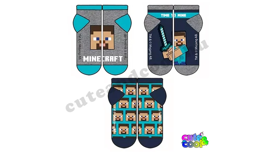 Három pár Steve-vel diszített Minecraftos titokzokni szett. Az élénk türkiz, szürke és sötétkék változatos színkombínációi, rajta a kivont karddal harcarakész Steve és Steve "arcai". Minecraft rajongónak szuper meglepetés lehet!