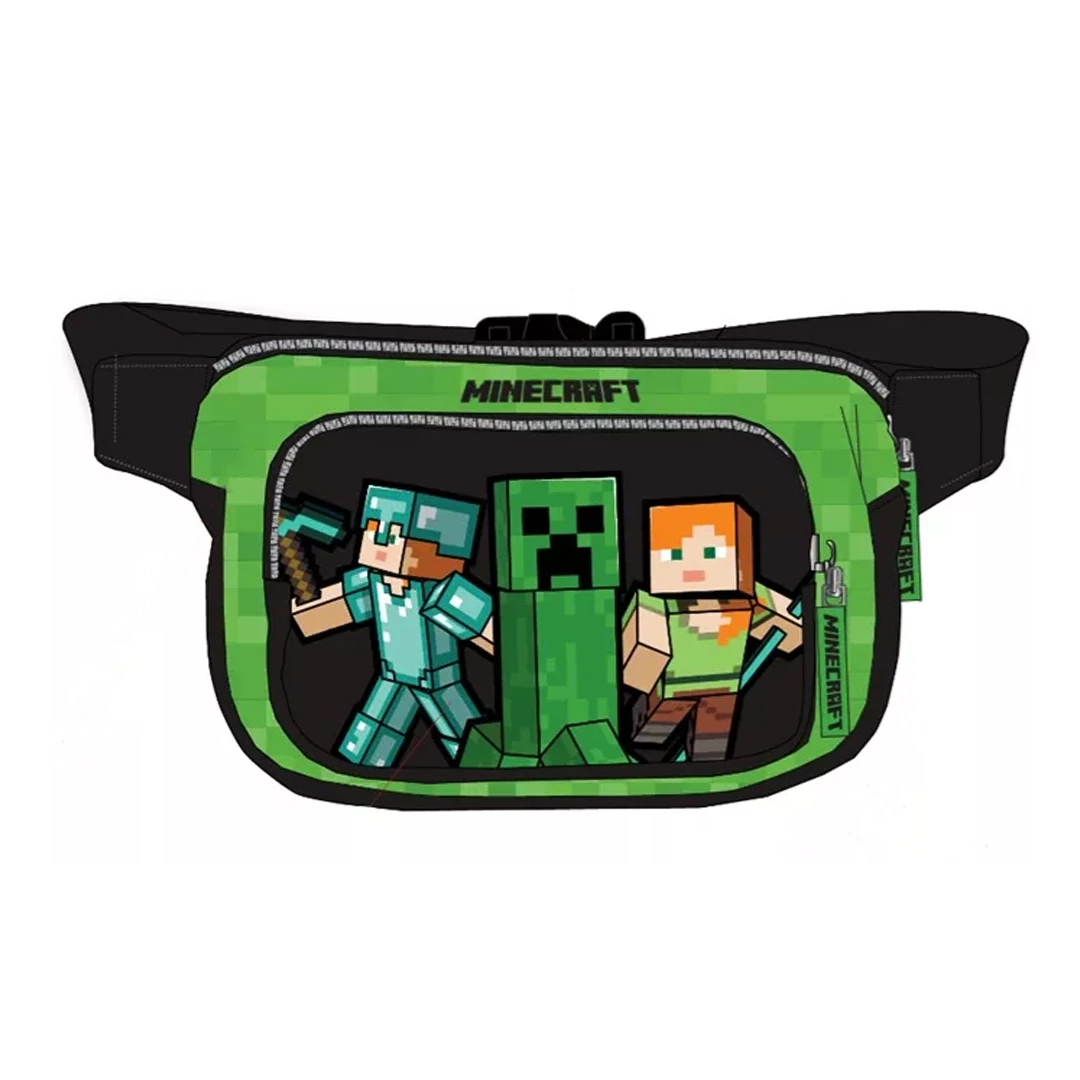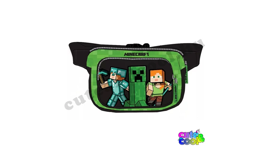 Minecraftos zöld-fekete övtáska Steve-vel, Alex-vel és Creeperrel. Van egy főrekesze és egy kisebb szintén cipzáras zsebe. Cipzárjainak nyelve Minecraft logós, gyorsan futók. Csattja erős de könnyen kezelhető.