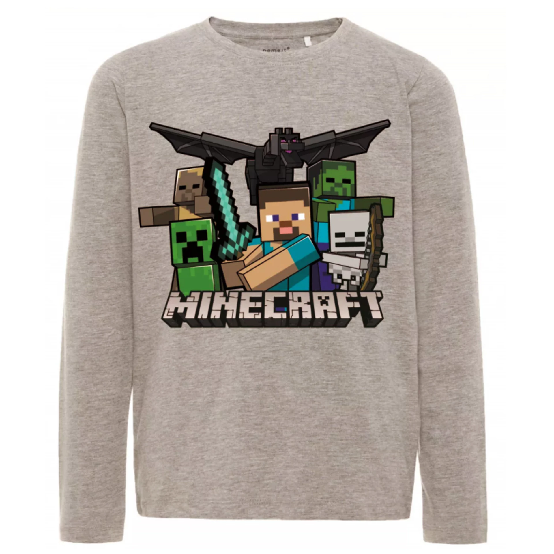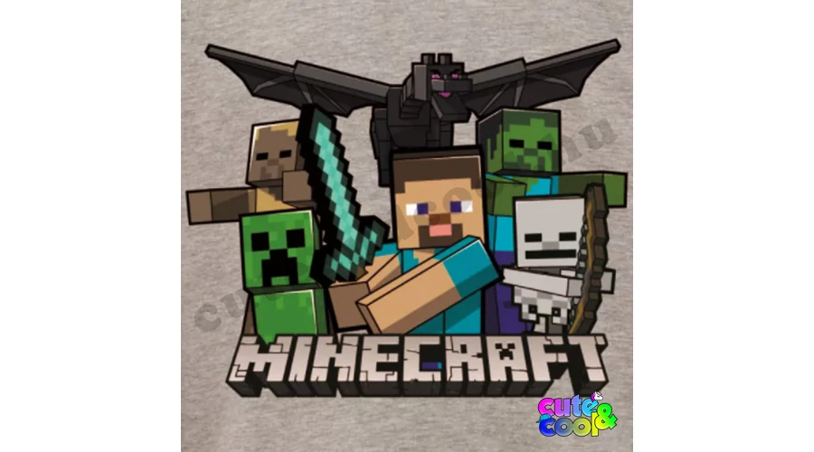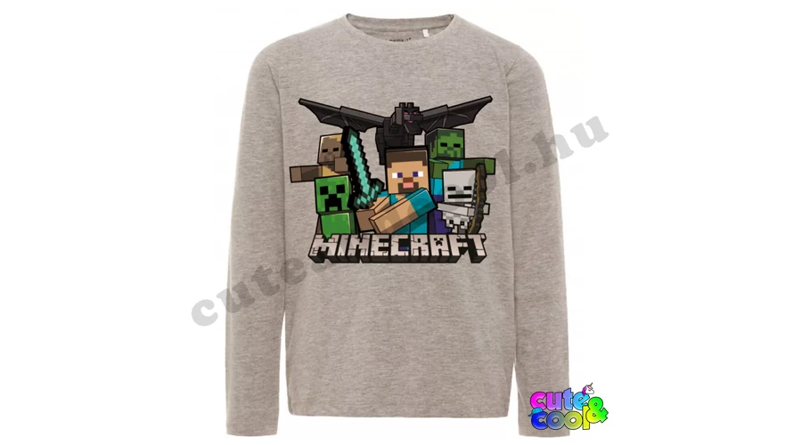 Sötétszürke Minecraftos hosszú ujjú póló. A felső anyaga finom pamut a kényelmes viseletért. A pólón a Minecraft logó felett kivont karddal Steve áll, mögötte a Végzet sárkány, creeper, csontváz, zombi, vízbefúlt zombi.
