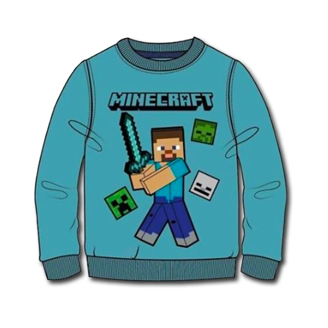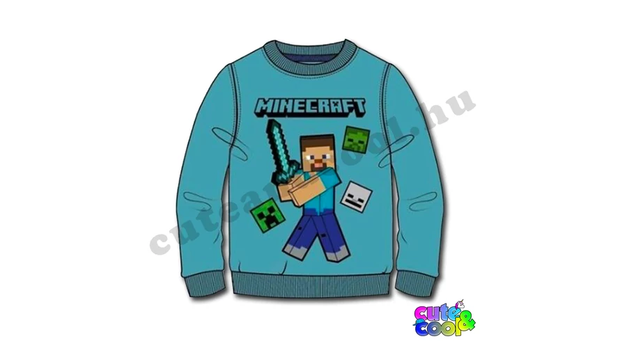 Vagány Minecraft gyerek pulóver rajta Steve kivont gyémántkarddal. Az élénk kék felsőn Minecraft logó és mobok fejei láthatüak. A pulcsi anyaga finom pamut, karjain és alján is gumis, igen kényelmes viselet.