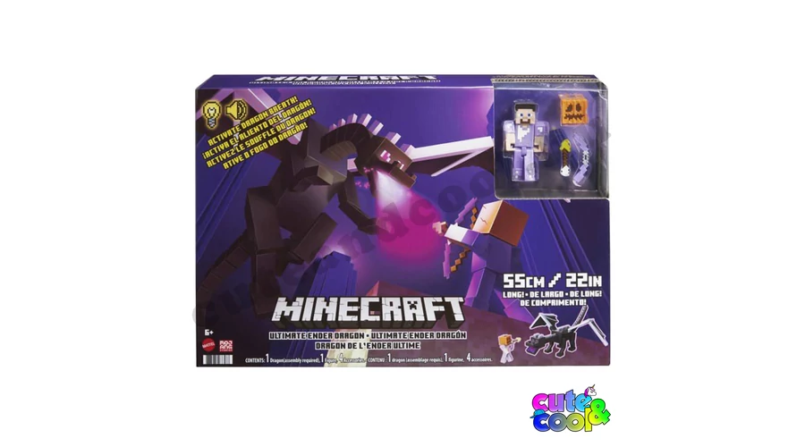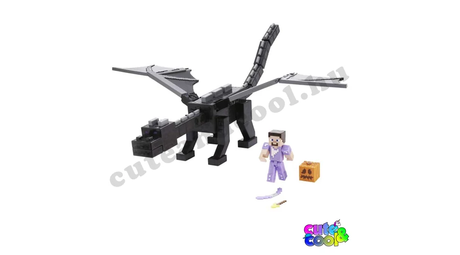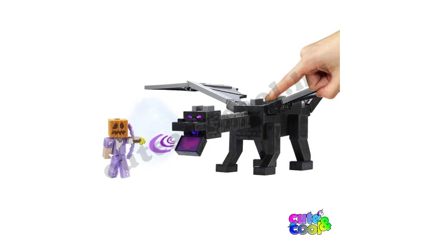 The main character of Minecraft, Steve, is ready to fight and defeat the Minecraft world's main villain, the Ender Dragon. Steve, with his enchanted armor, enchanted bow, and arrow, travels to the End to fight the 55cm Ender Dragon! He must be careful because the dragon's roar is nothing compared to its destructive power. The premium-quality game set is well-crafted to match the Minecraft world. The characters' bodies feature pixelated designs as if they came to life from the computer world. The dragon needs to be assembled first, and then its tail, neck, wings, and legs are all movable. You can even simulate flying with it. The spikes on the dragon's back hide three buttons.