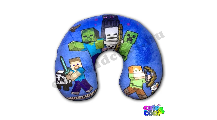 Vibrant colored, Minecraft patterned travel pillow, also known as a neck pillow for kids! If you tend to easily fall asleep in the car, this pillow can be a great choice for you. You simply put the soft-feel pillow around your neck and you can start enjoying a comfortable sleep. You just need to wake up when you arrive! The dark blue pillow features Minecraft characters, Steve, Alex, and monsters such as Enderman, Skeleton, and Creeper.
