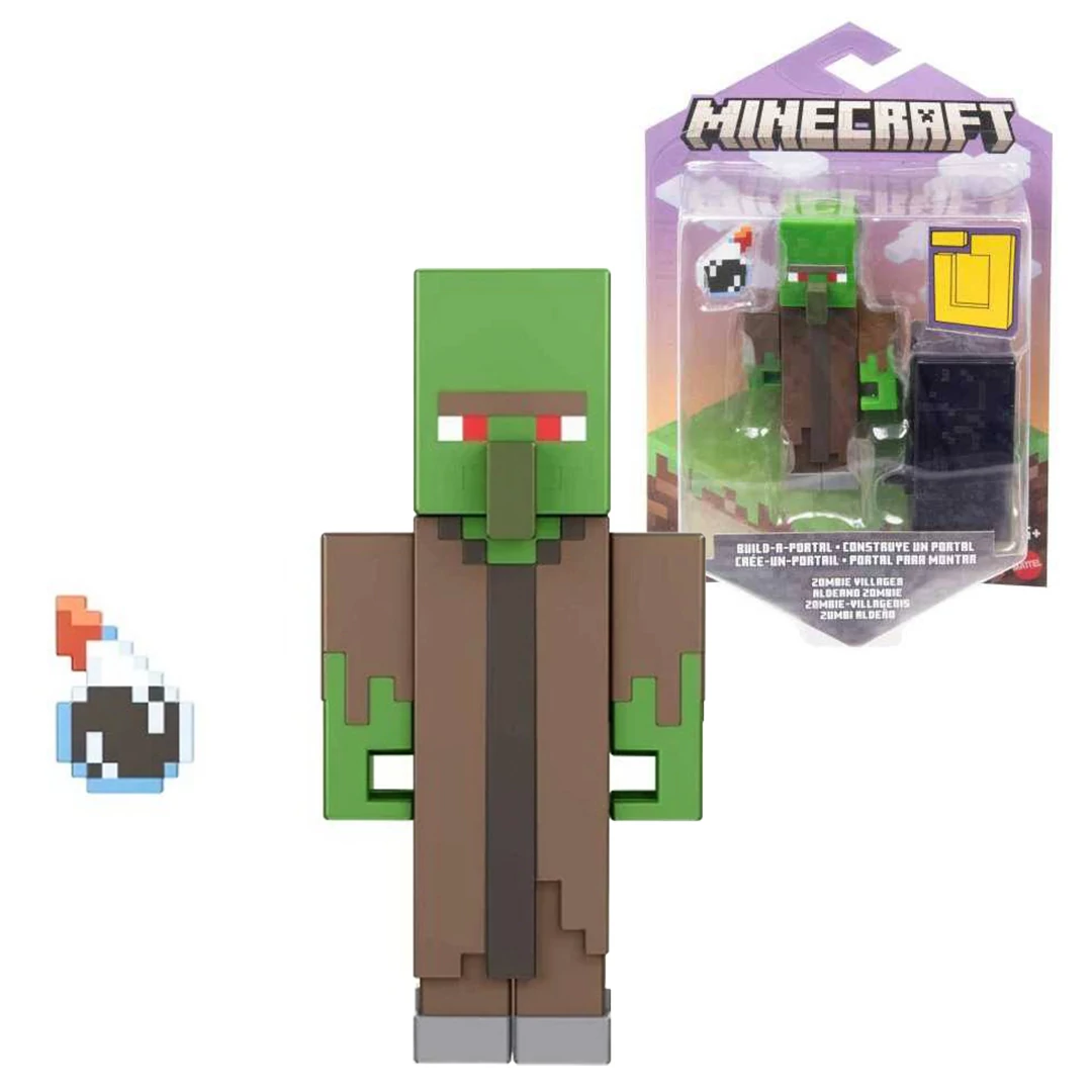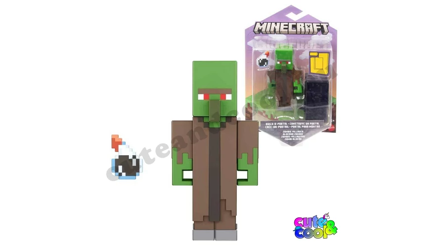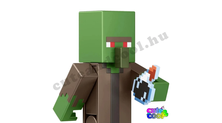 A Minecraft falusi zombi műanyag játékfigura csomag tartalmaz egy figurát, karjai mozgathatóak és kezébe adható a kis üvegcse. A dobozban van még egy nagy obszidián blokk,