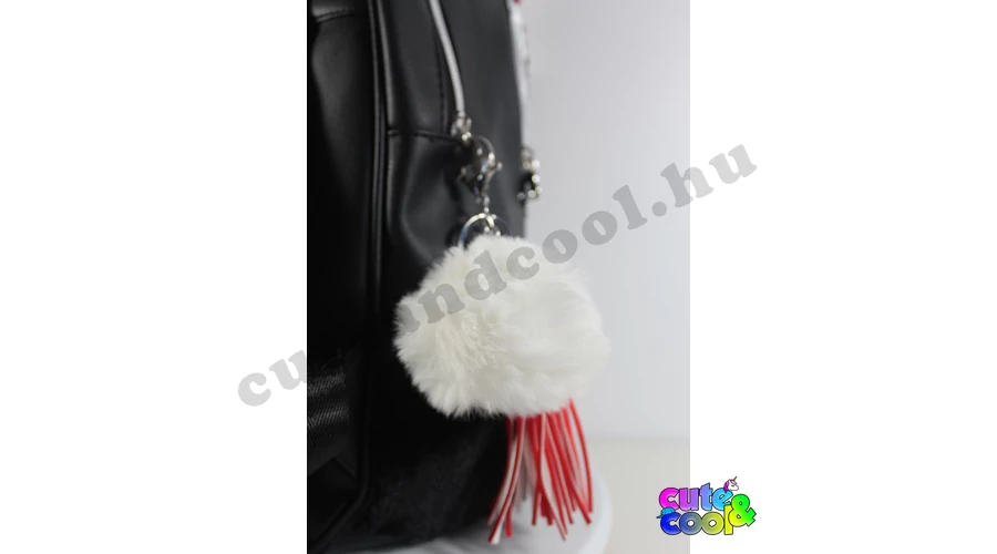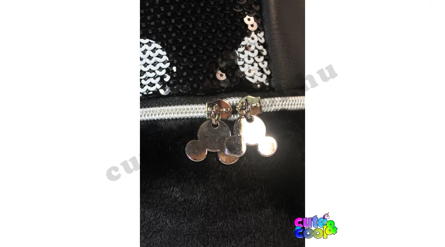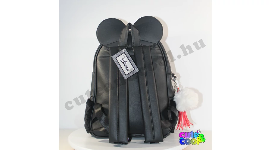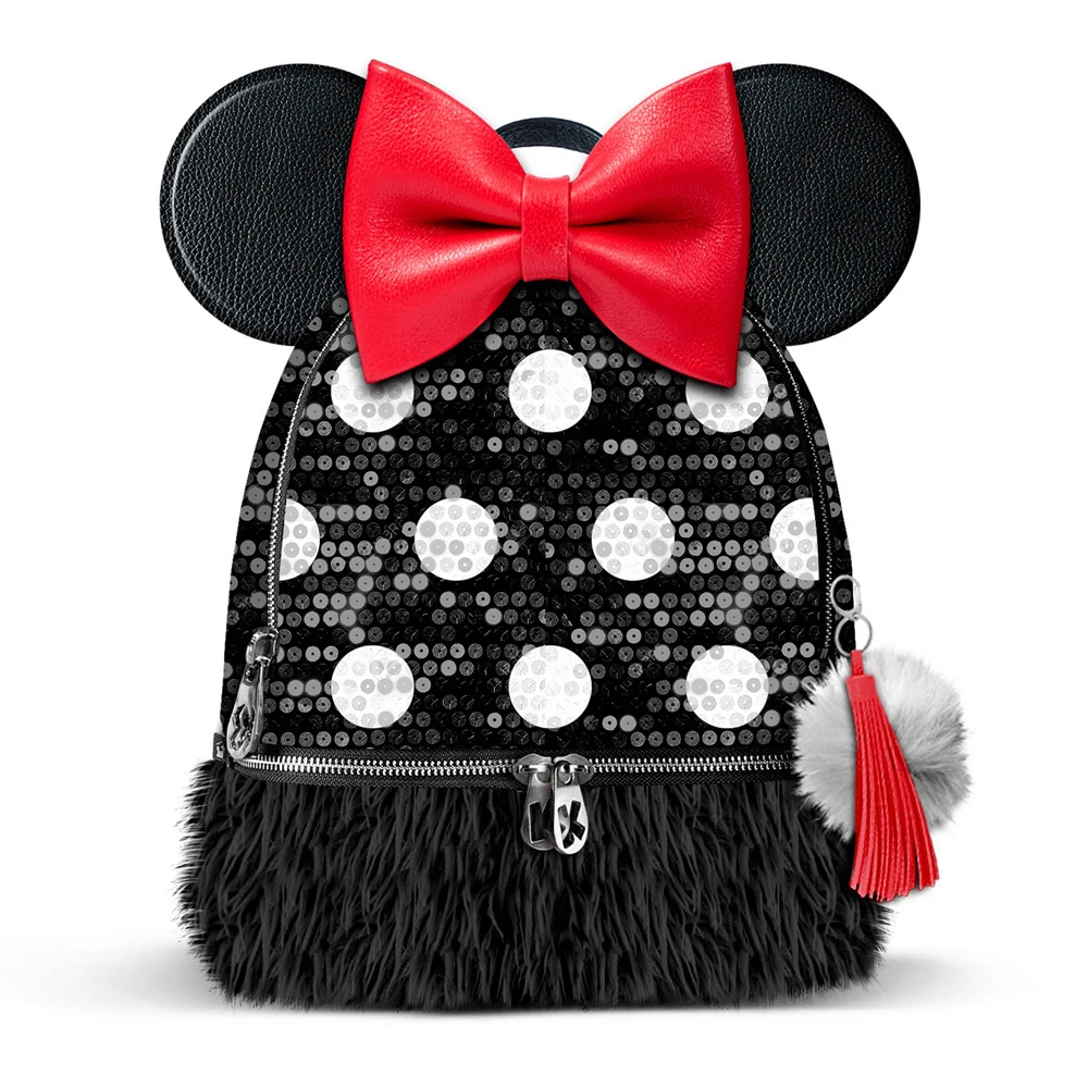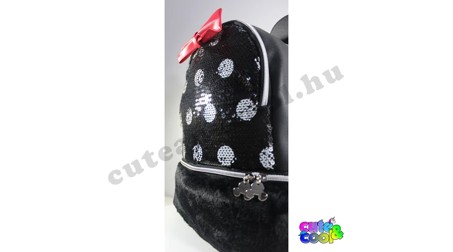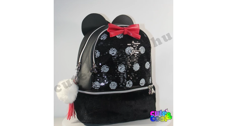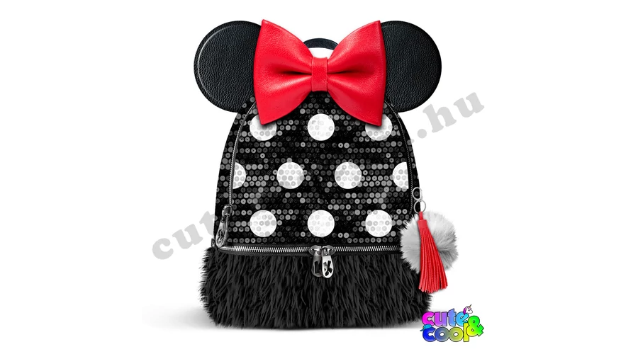 Különleges Minnie Egér műbőr flitteres, szőrmés hátizsák, ikonikus Minnie fülekkel és piros masnival díszítve.