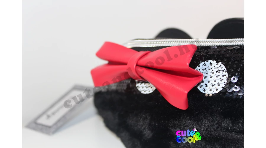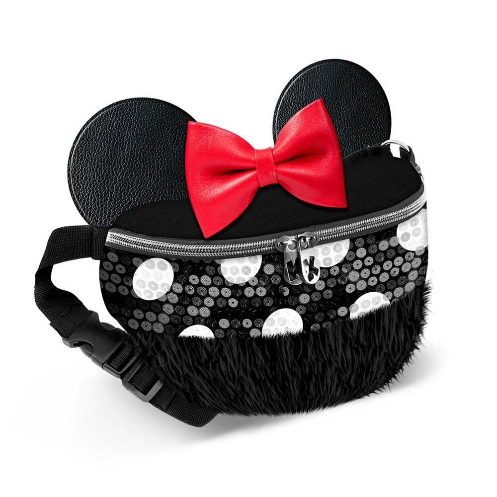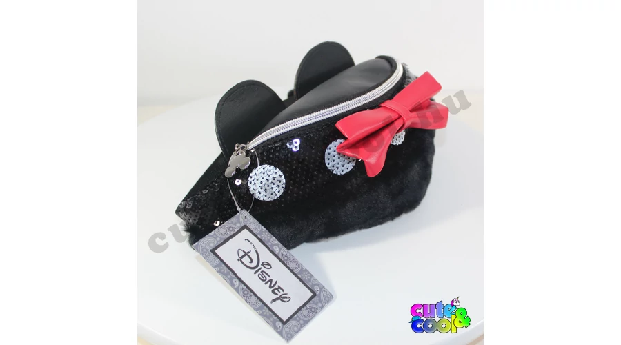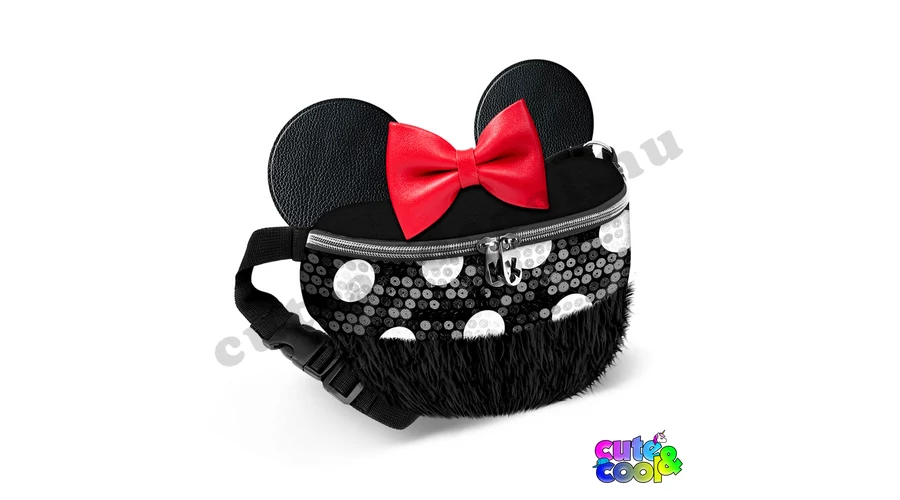 Különleges Minnie Egér flitteres, szőrmés műbőr övtáska, ikonikus Disney Minnie fülekkel és piros masnival díszítve.