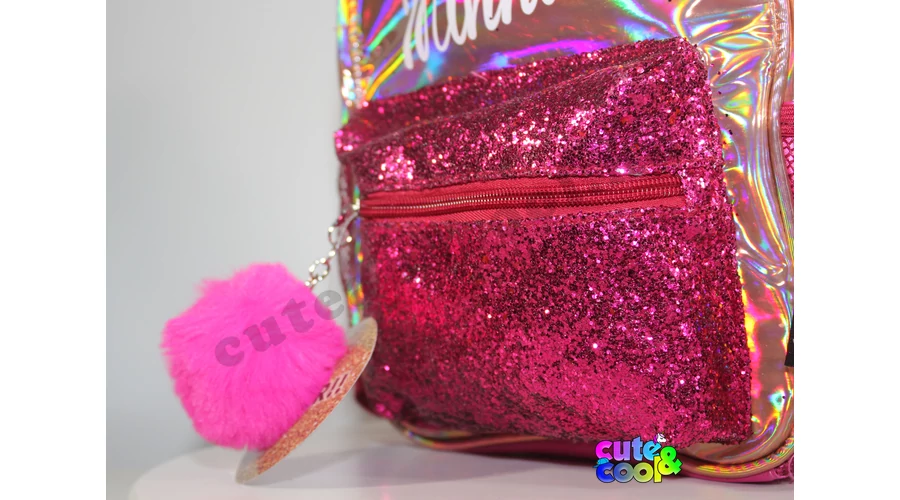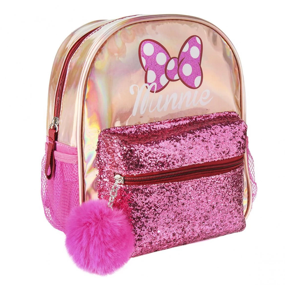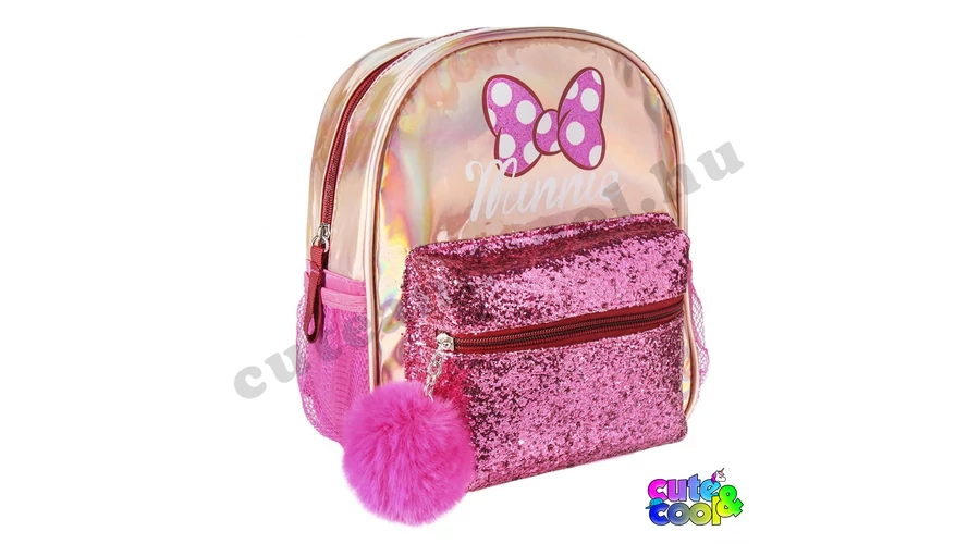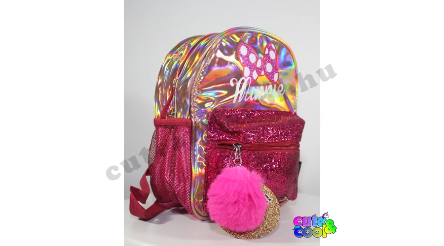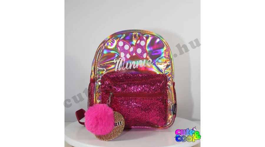 - small-sized Minnie Mouse bag - premium quality - massive, durable - glittery and holographic design - two zipped comparments - one mesh pockets on the sides - adjustable shoulder straps - padded back - featuring iconic butterfly bow of Minnie from the famous Disney series Excellent choice for everydays!