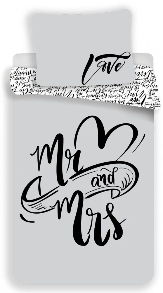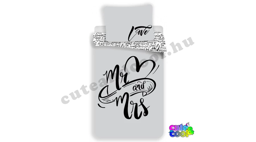 A Mr. és Mrs. ágyneműhuzat trendi megjelenésével tökéletes kiegészítője egy modern hálószobának! A puha tapintású 100% pamut paplan és párnahuzat nem csupán divatos, hanem kellemes pihenést biztosít. A paplanhuzat elejét Mr és Mrs felirat és szivecskék díszítik míg a hátoldal fehér alapon fekete cirádás betűvel írott szöveg látható.A párnát Love felirat díszíti. Trendi nászajándék ötlet, de házaspároknak is szép ajándék!