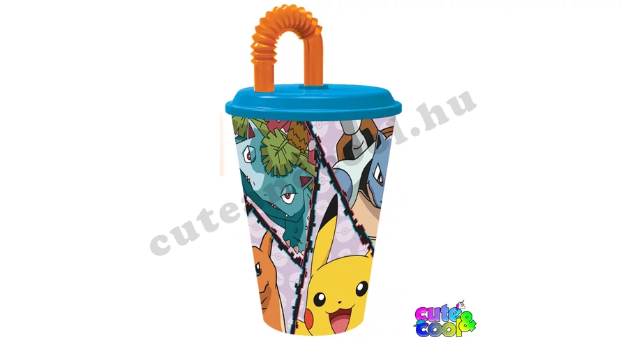 A Pokémon-themed plastic cup with a straw and a sealable lid, decorated with the main characters from the Pokémon series, such as Pikachu, Charizard, Venousaur, and Blastoise. The cup is made of BPA-free plastic. It makes a great gift for Pokémon fans!