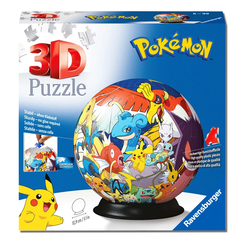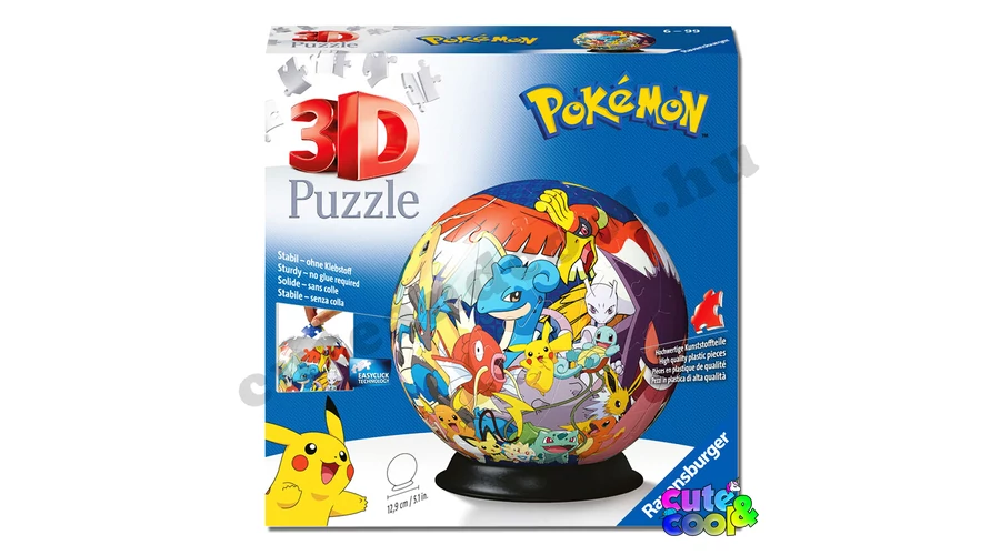 Jó szórakozás és szép dísz, ez a puzzle! A Pokémon világ legfontosabb Pokémonjait találod meg ezen a 3D-s gömb alakú Pokémon kirakóson. Pikachut, Mewtwot, Lucariot és Ho-oh legendás pokémont is láthatod rajta. 73 darabos kirakóst végül egy talpra helyezheted, hogy ne guruljon el és az íroasztalod, éjjeli szekrényed díszítse.