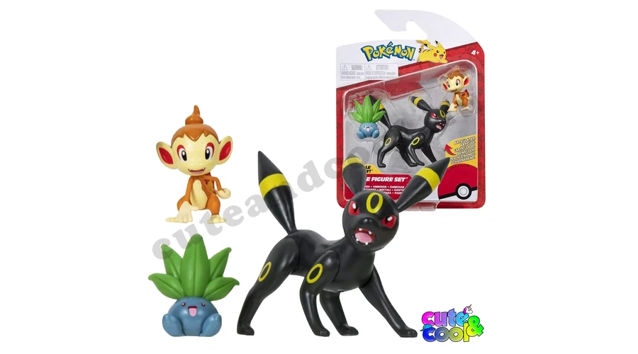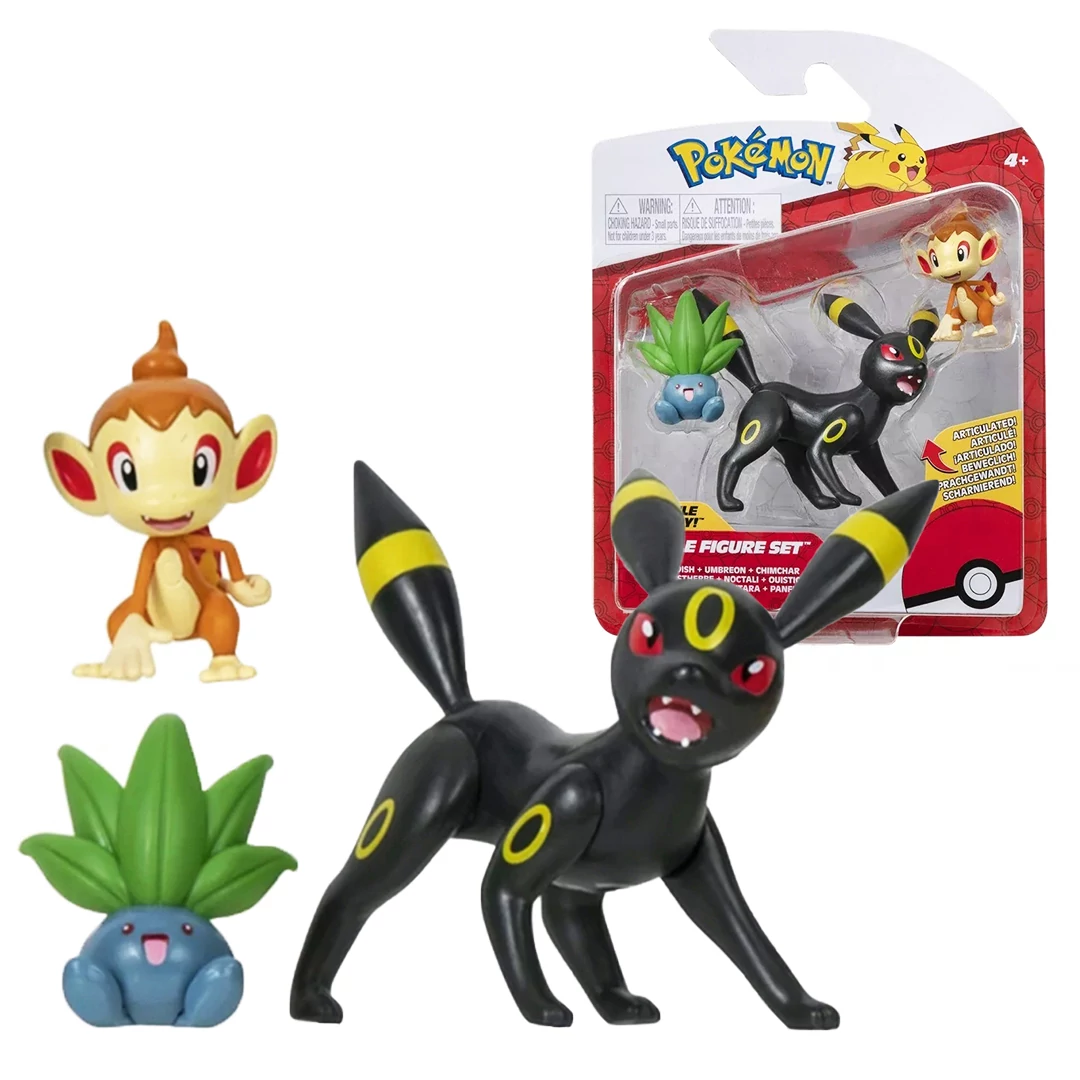 Gyűjthető Pokémon harci figurák 3db-os szettben. A fű típusú, kis pokémon Oddish, a csimpénzszerű, tűz pokémon Chimchar és a lenyűgöző, négylábú, sötét típusú Umbreon pokémon találhatóak ebben a csomagban. A pokémonok kompatibilisek a Clip 'N' Go szériával. A nagyobb pokémonnak mozgathatóak a testrészei. Remek szórakozás egy kis pokémon rajongónak!