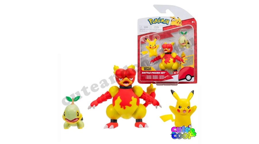 Gyűjthető Pokémon harci figurák 3db-os szettben. A kis teknős pokémon Turtwig, az elektromos híresség, Pikachu, és a két lábon járó, izzó magma, Magmar pokémonok találhatóak ebben a csomagban. A pokémonok kompatibilisek a Clip 'N' Go szériával. A nagyobb pokémonnak mozgathatóak a testrészei. Remek szórakozás egy kis pokémon rajongónak!