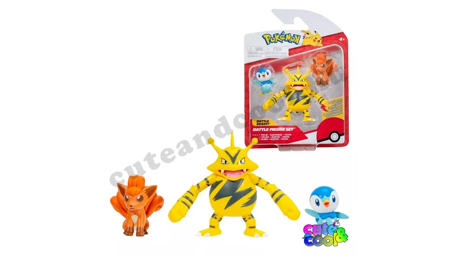 Gyűjthető Pokémon harci figurák 3db-os szettben. A víz típusú, kis pokémon Piplup, a rókaszerű, tűz pokémon Vulpix és a két lábon járó, elektromos típusú behemót, Electabuzz pokémonok találhatóak ebben a csomagban. A pokémonok kompatibilisek a Clip 'N' Go szériával. A nagyobb pokémonnak mozgathatóak a testrészei. Remek szórakozás egy kis pokémon rajongónak!